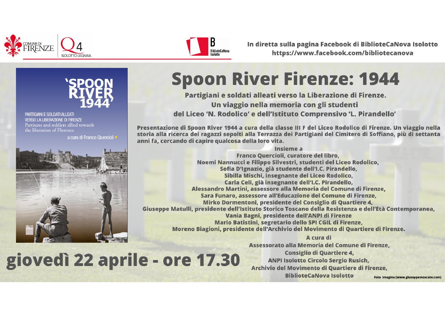 • Giovedì 22 aprile, ore 17.30, Streaming - diretta sulla pagina Facebook della BiblioteCaNova, presentazione del libro ‘Spoon River 1944. Partigiani e soldati alleati verso la Liberazione di Firenze', un viaggio nella memoria con gli studenti del Liceo ‘N. Rodolico’ e dell’Istituto Comprensivo ‘L. Pirandello’, un libro e un video promossi dal Comune di Firenze e dal Consiglio di Quartiere 4, realizzati dall’Archivio del Movimento di Quartiere, in collaborazione con l’Anpi, la Camera del Lavoro e lo Spi Cgil, in lingua italiana e inglese (Edizioni CdeV). Partecipano: Alessandro Martini, assessore alla Memoria del Comune di Firenze; Sara Funaro, assessore all’Educazione del Comune di Firenze; Mirko Dormentoni, presidente del Consiglio di Quartiere 4; Giuseppe Matulli, presidente dell’Istituto Storico Toscano della Resistenza e dell’Età Contemporanea; Vania Bagni, presidente dell’Anpi di Firenze; Mario Batistini, segretario dello Spi Cgil di Firenze; Moreno Biagioni, presidente dell’Archivio del Movimento di Quartiere di Firenze; Franco Quercioli, curatore del libro; Noemi Nannucci e Filippo Silvestri, studenti del Liceo Rodolico; Sofia D’Ignazio, già studente dell’I.C. Pirandello; Sibilla Mischi, insegnante del Liceo Rodolico; Carla Celi, già insegnante dell’I.C. Pirandello.