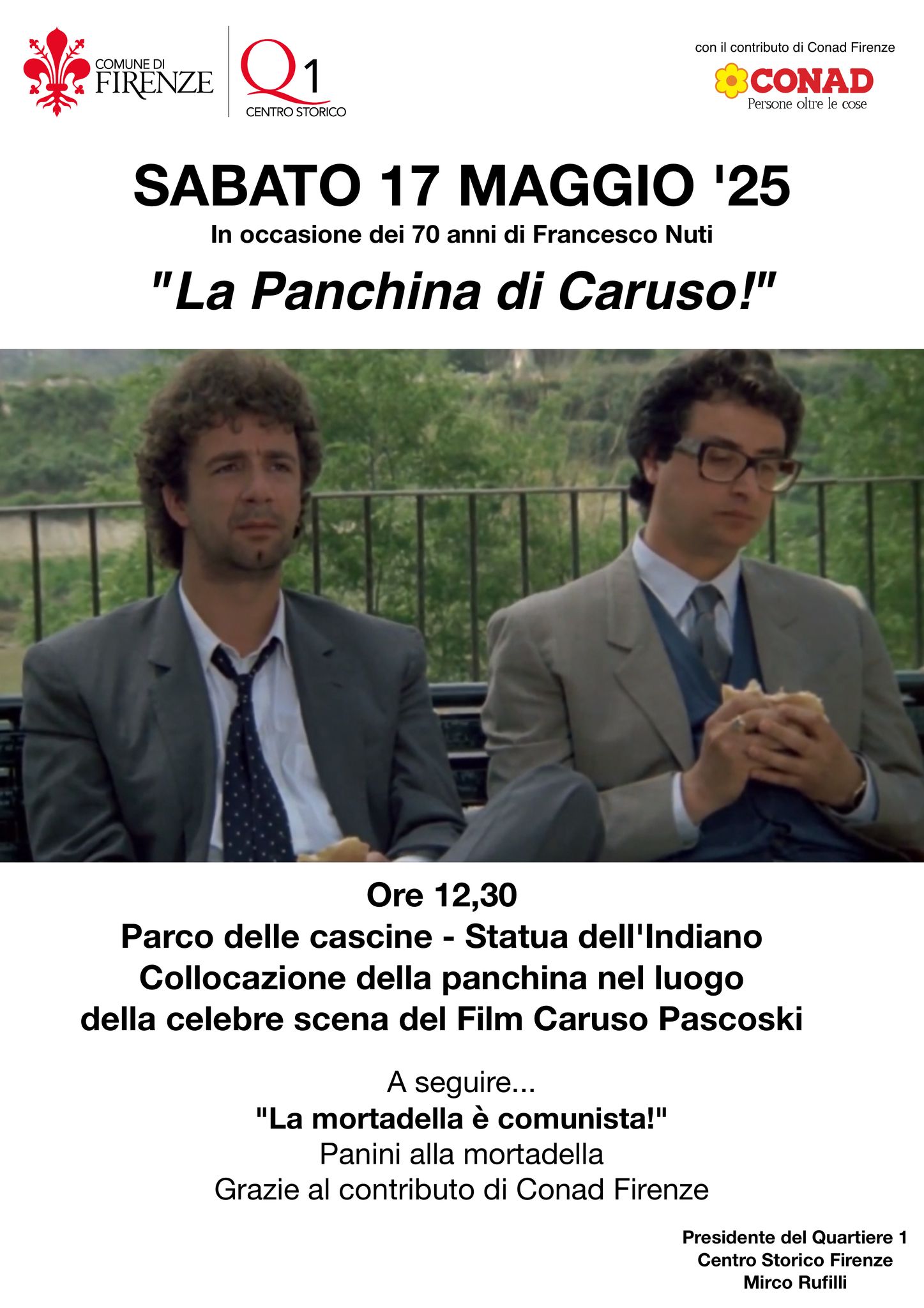 ore 12:30 Parco delle Cascine, statua dell'Indiano, "La panchina di Caruso", inaugurazione della panchina di Caruso Pascoski, a seguire "La mortadella è comunista", panini alla mortadella grazie a Conad