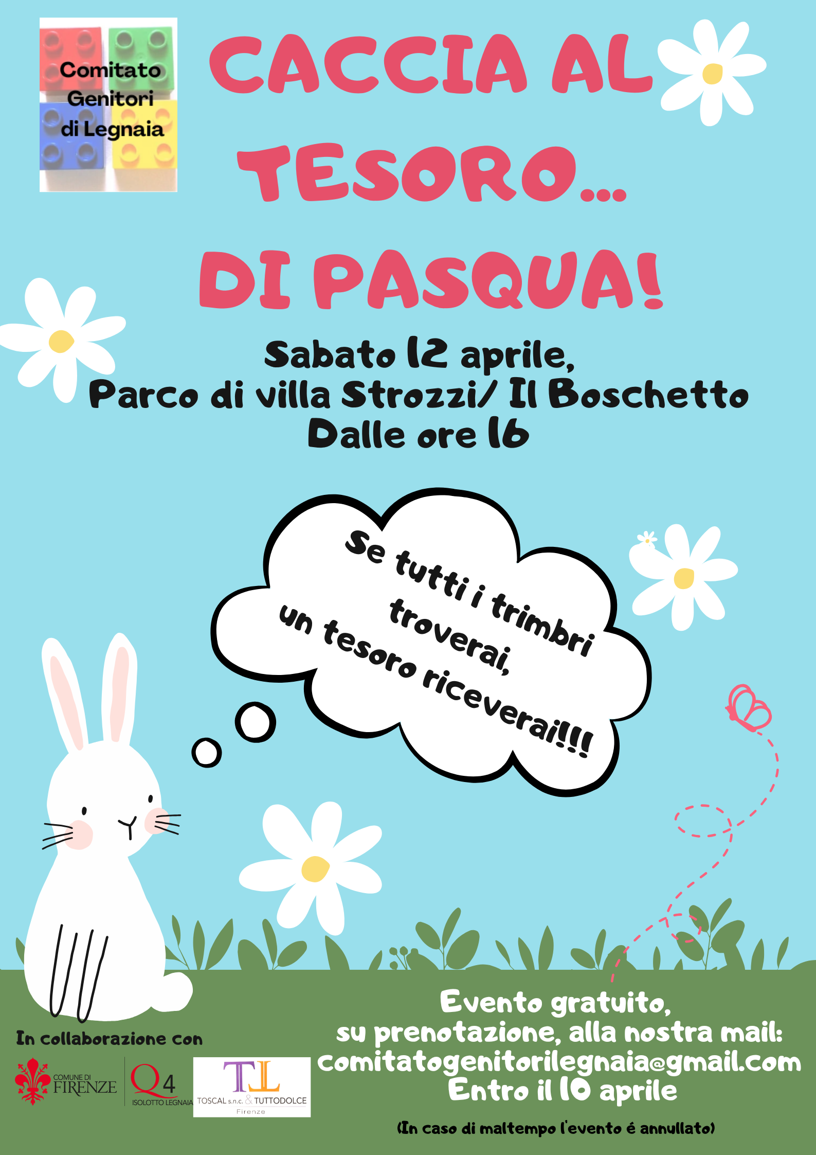 Il Comitato Genitori di Legnaia organizza una divertente Caccia al Tesoro di Pasqua sabato 12 aprile presso il Parco di Villa Strozzi/Il Boschetto, a partire dalle ore 16.