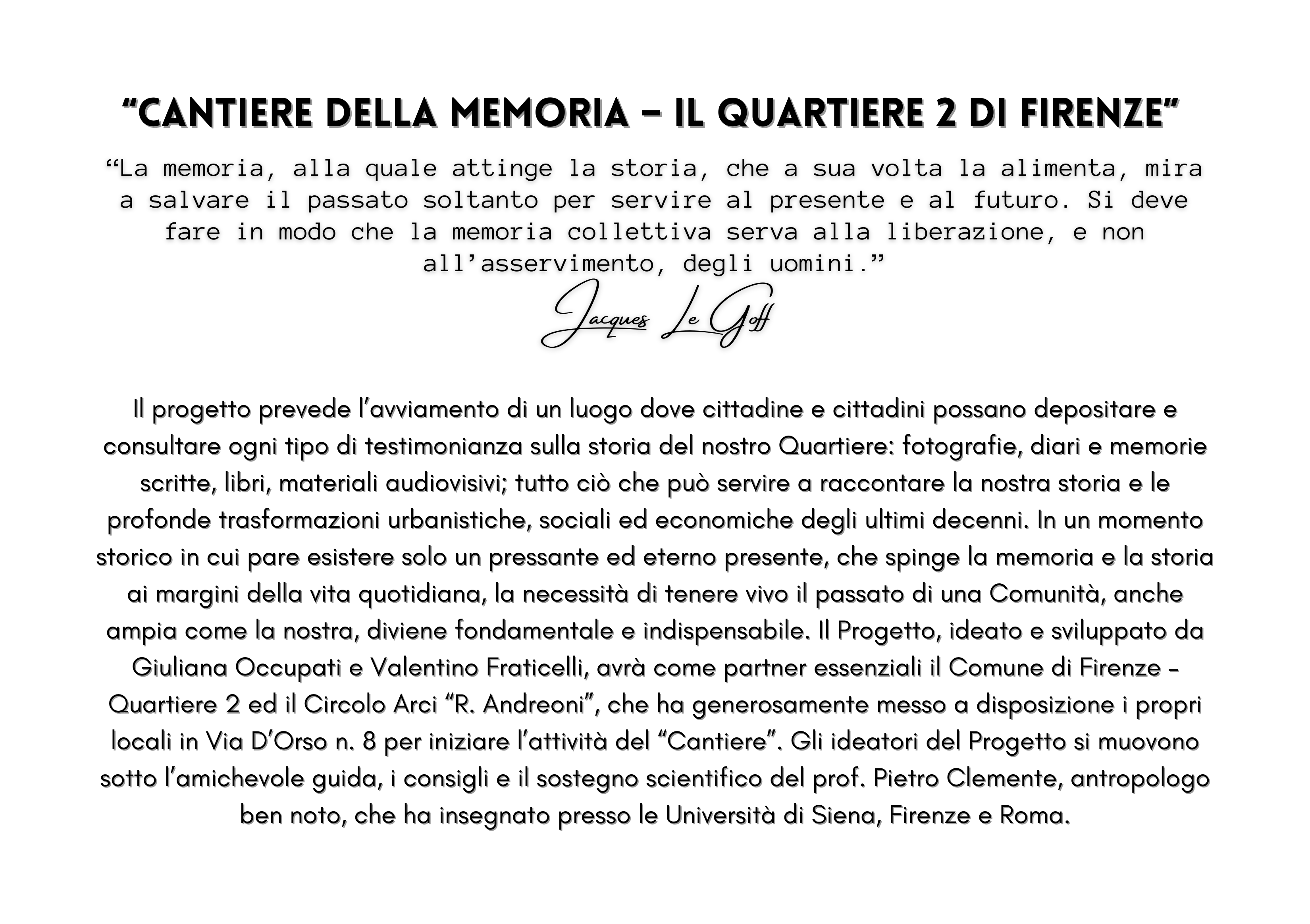 Giovedì 28 marzo alle ore 17:00, nella Sala Consiliare di Villa Arrivabene, si terrà l'evento di presentazione del "Cantiere della Memoria", un progetto che vuole creare un luogo di appartenenza di tutti i cittadini del quartiere al quale affidare memorie scritte, audiovisivi, fotografie, libri e altro ancora; tutto il materiale che possa servire a raccontare il Quartiere 2 e le sue trasformazioni negli ultimi decenni.