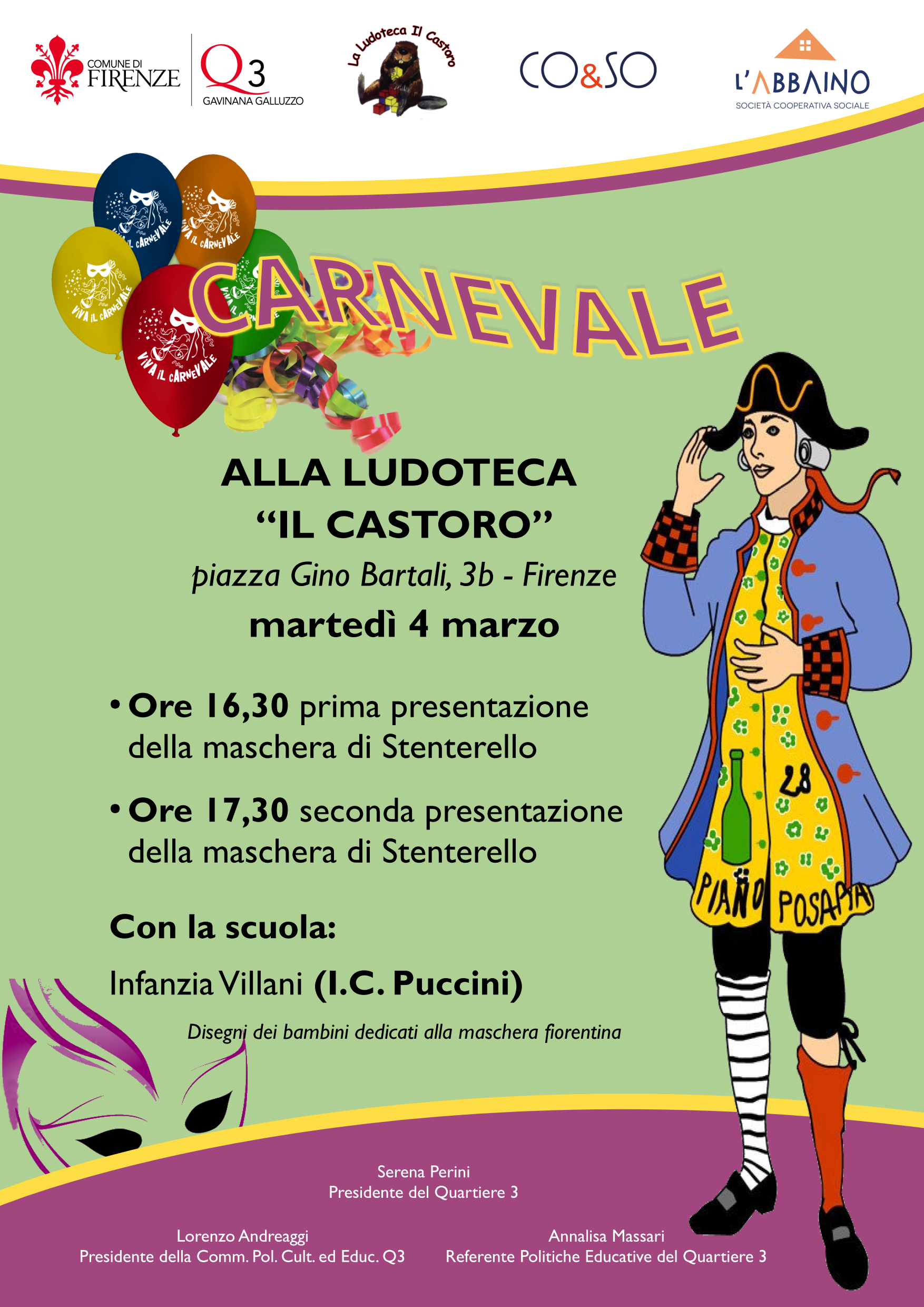 Martedì 4 marzo a partire dalle ore 16:30 si svolgerà il carnevale alla ludoteca "Il Castoro" (in piazza Bartali, 3b - Firenze) con la presentazione della maschera di Stenterello.