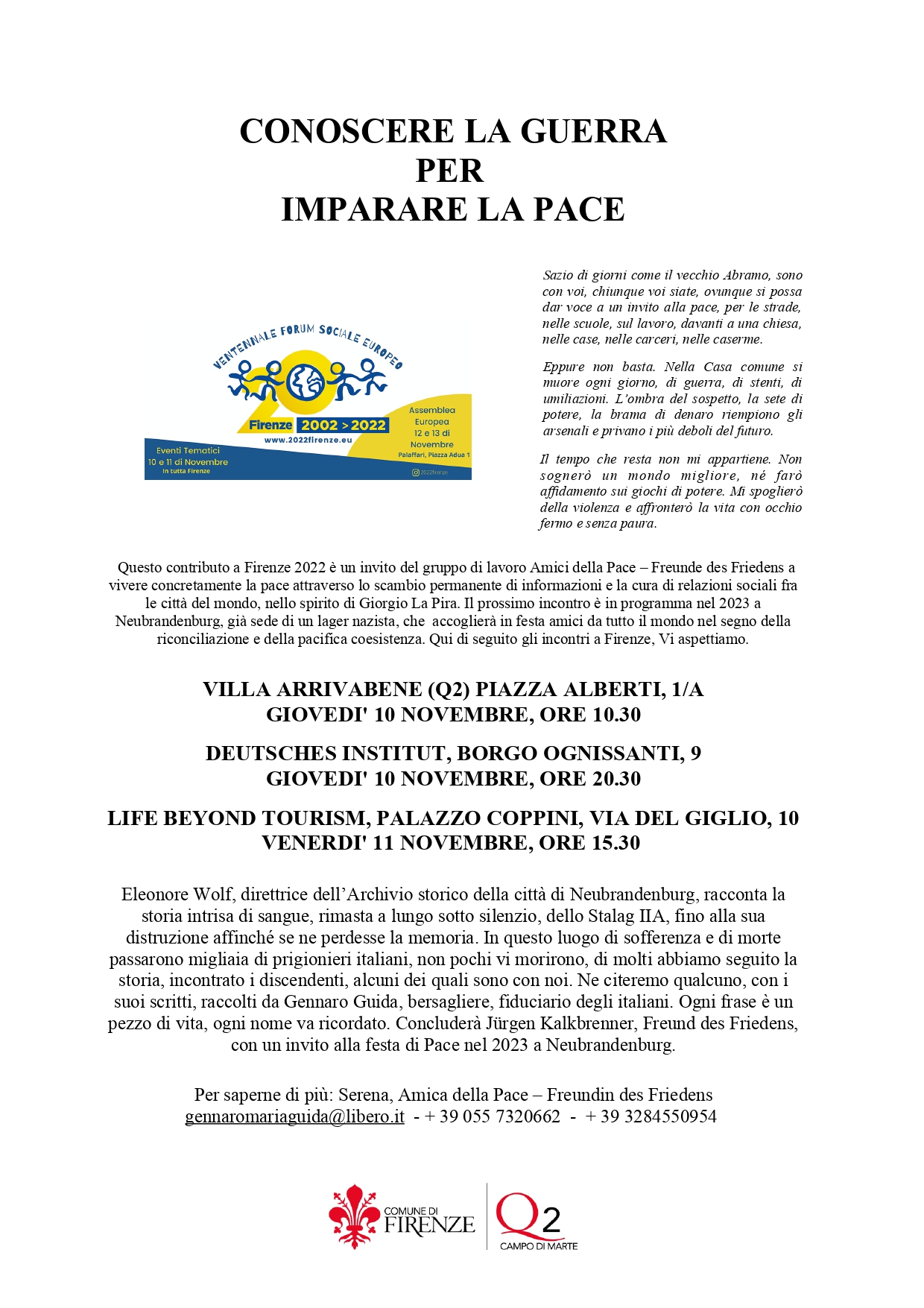 Giovedì 10 Novembre alle ore 10.30, nella Sala Consiliare in Villa Arrivabene, si terrà l'incontro "Conoscere la guerra per imparare la pace", promosso dal gruppo di lavoro Amici della Pace - Freunde des Friedens con la collaborazione del Quartiere 2. Gli altri incontri in programma, organizzati dal gruppo di lavoro, si svolgeranno giovedì 10 alle ore 20.30 al Deutsches Institut (Borgo Ognissanti n. 9) e venerdì 11 Novembre ore 15.30 a Palazzo Coppini (Via del Giglio n.10).