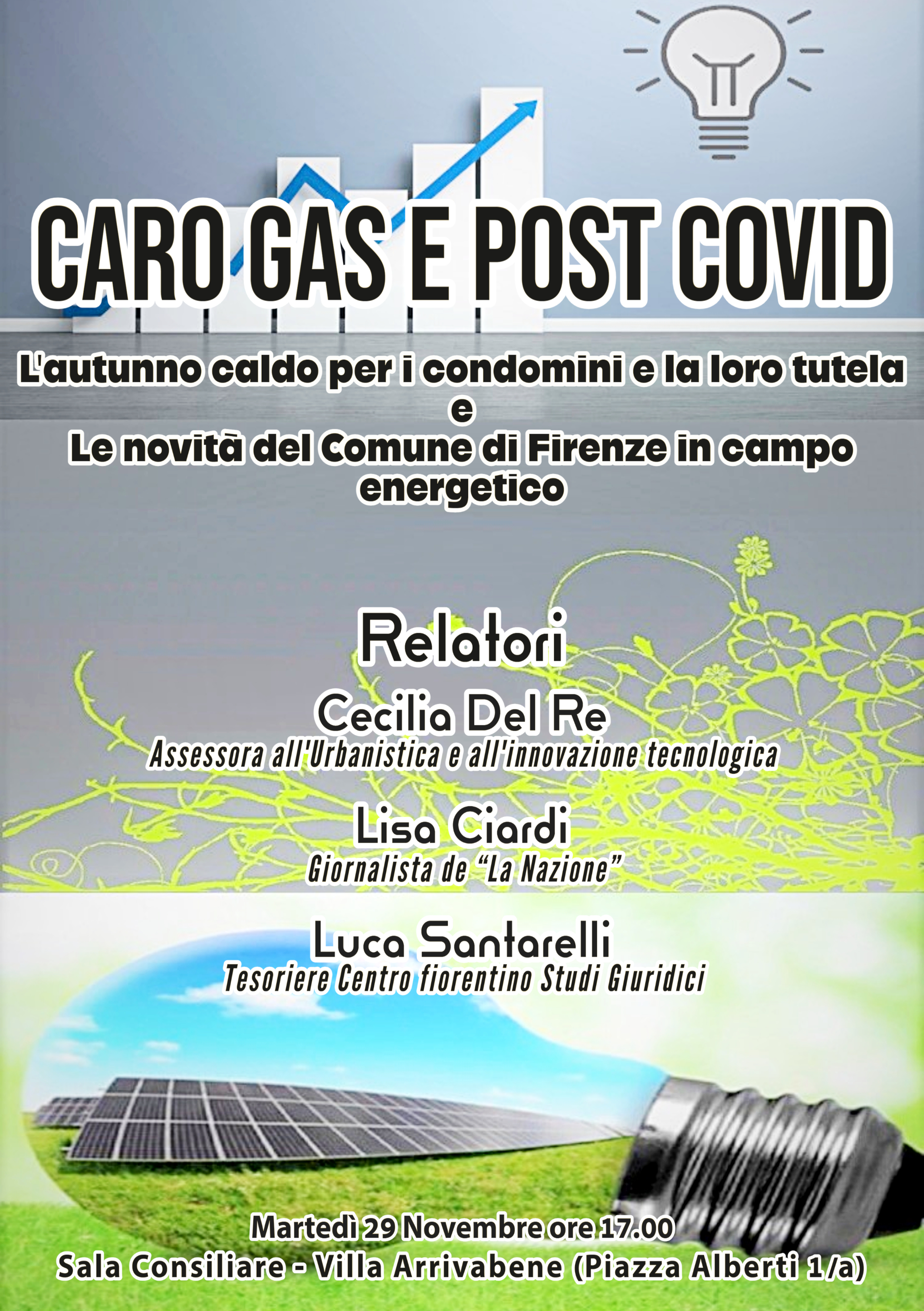 Martedì 29 Novembre alle ore 17.00, nella Sala Consiliare in Villa Arrivabene, si terrà il convegno ad ingresso libero e gratuito "Caro gas e post covid - L'autunno caldo per i condomini e la loro tutela e le novità del Comune di Firenze in campo energetico" a cura del Centro Fiorentino Studi Giuridici.