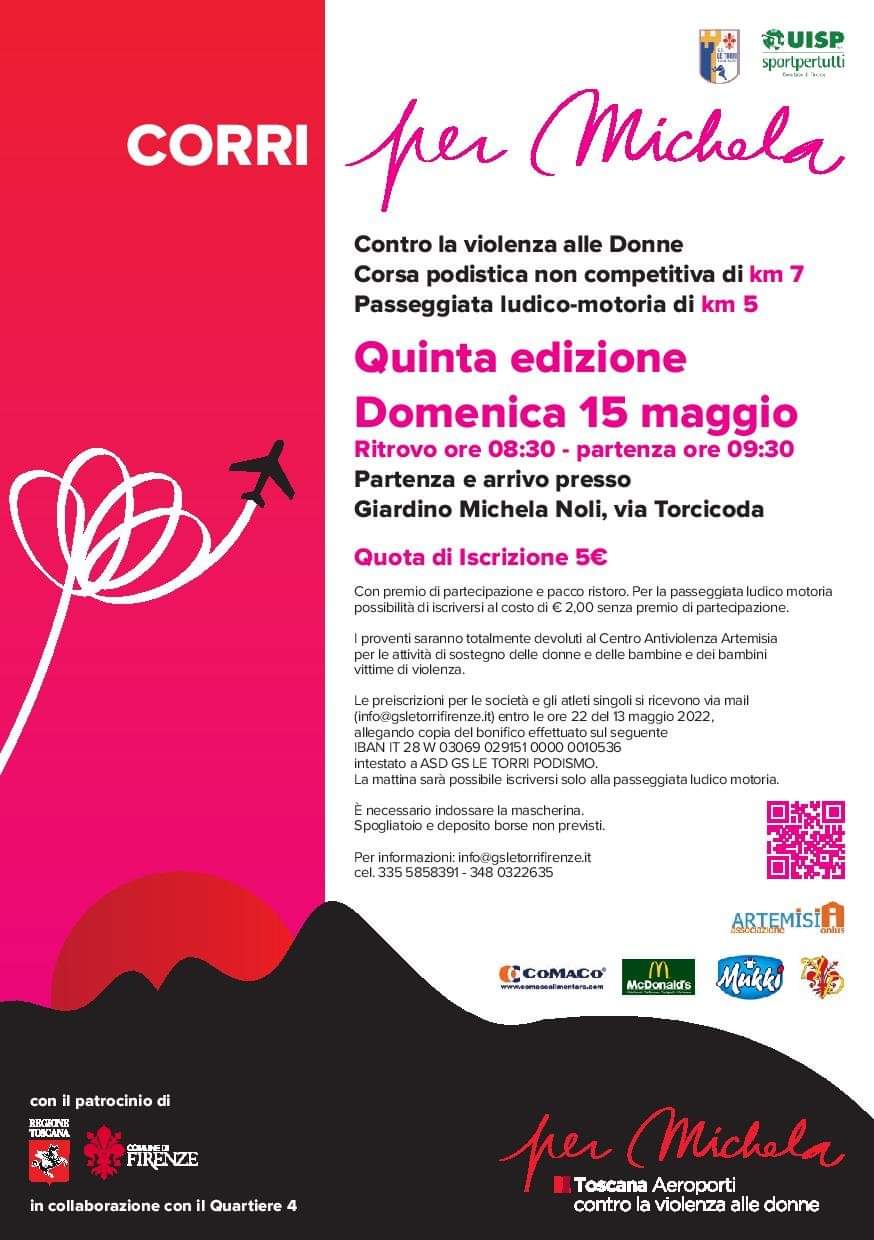 Appuntamento domenica 15 maggio con il 5° Trofeo ‘Corri per Michela’, organizzato dal Gruppo Sportivo A.S.D. Gs Le Torri Podismo, in collaborazione con Toscana Aeroporti, Artemisia Centro Antiviolenza e Quartiere 4.