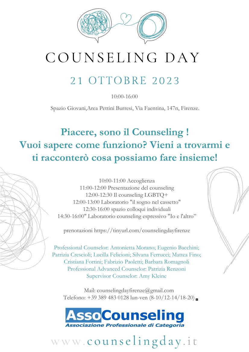Di seguito il programma della giornata; per info e prenotazioni utilizzare il link: https://tinyurl.com/counselingdayfirenze.