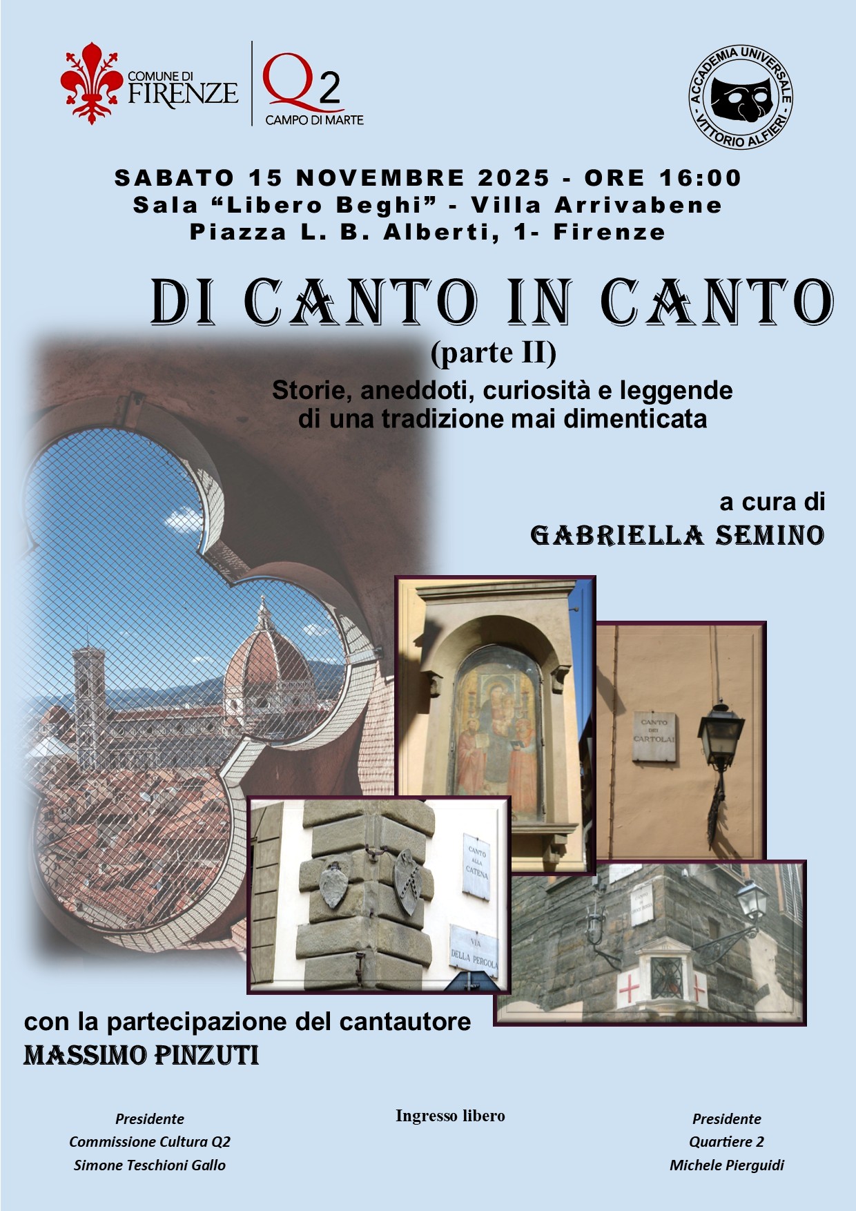 Sabato 15 Novembre alle ore 16.00, nella Sala Libero Beghi in Villa Arrivabene, si terrà l'evento a cura di Gabriella Semino dal titolo "Di Canto In Canto - Parte II"; un incontro-racconto con al centro la storia dei canti antichi della città di Firenze, tra aneddoti e curiosità di luoghi entrati nella tradizione.