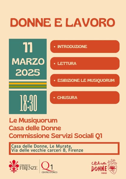 Fa parte di "Marzo Donna", un mese di iniziative per celebrare la Giornata Internazionale della Donna, l'esibizione del coro Le Musiquorum alla Casa delle donne delle Murate il prossimo 11 marzo alle ore 18.30