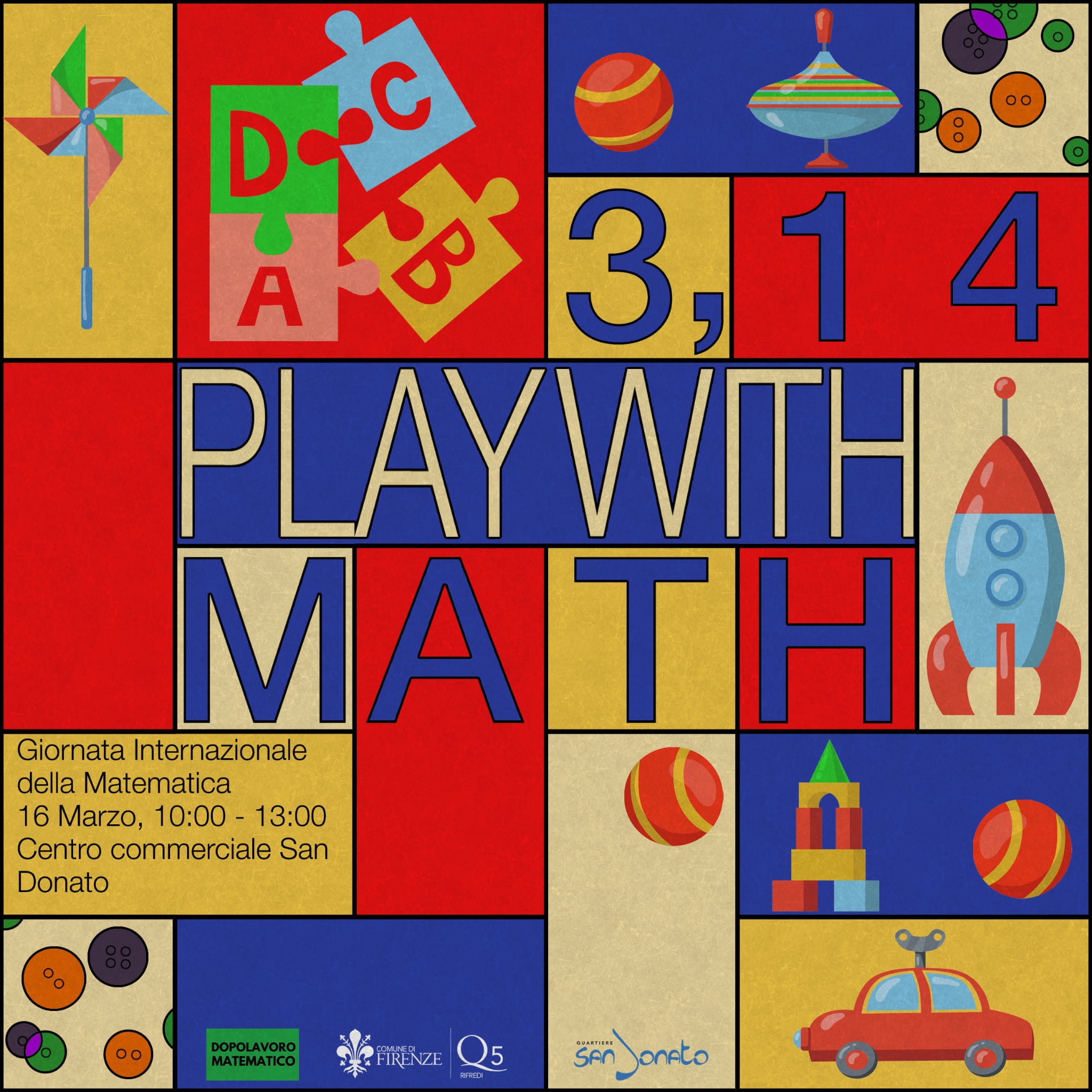 Il Dopolavoro Matematico è un progetto politico nato a Roma a gennaio 2022. Nello spirito del Dopolavoro, l’obiettivo sarà di provare a portare la matematica in luoghi e situazioni non convenzionali, per cercare di abbattere gli stereotipi che troppo spesso accompagnano questa disciplina, percepita come qualcosa di non accessibile a tutti. L’incontro si terrà sabato 16 marzo nella piazza di San Donato, nel Quartiere 5, all’interno del Centro Commerciale, dalle ore 10 alle ore 13.