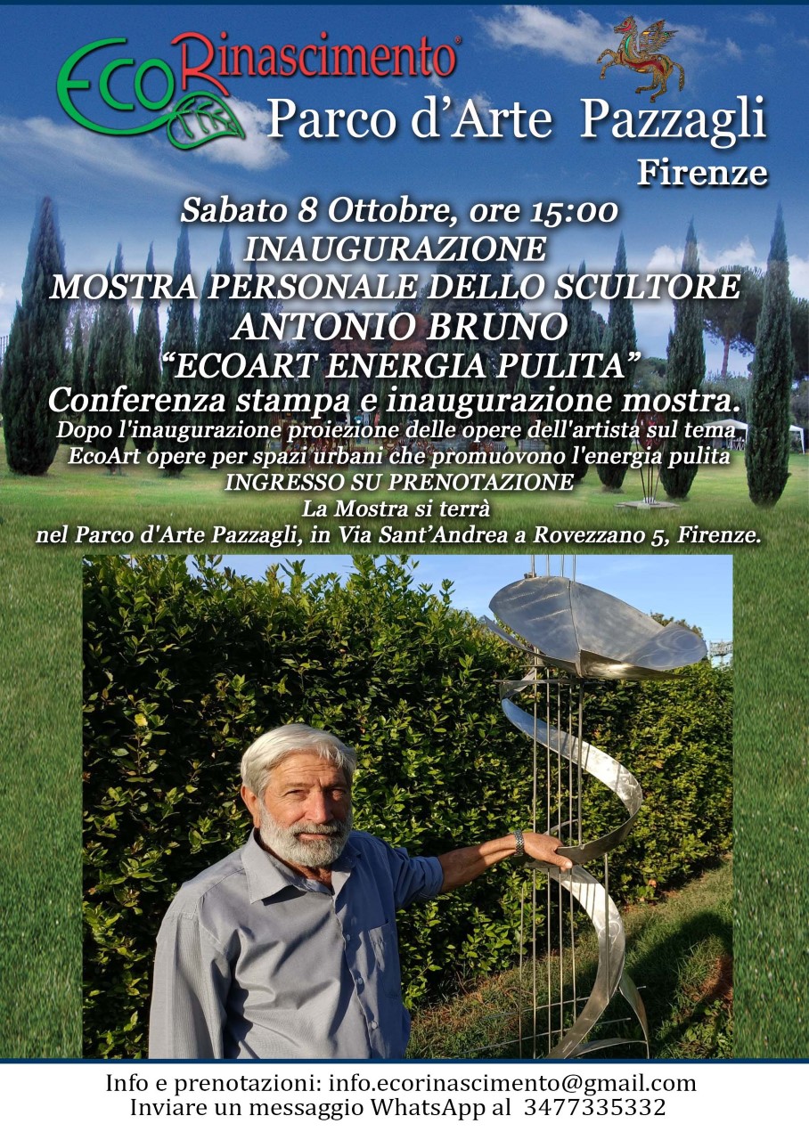 Sabato 8 Ottobre alle ore 15:00 verrà inaugurata al Parco d'Arte Pazzagli, in Via Sant’Andrea a Rovezzano 5, la mostra personale dello scultore Antonio Bruno dal titolo "EcoArt Energia Pulita"; a seguito verrà effettuata una proiezione delle opere dell'artista sul tema EcoArt ed energia pulita, nel cui contesto l'artista illustrerà i propri lavori. ll Parco, aperto per l'occasione dalle 11 alle 21, vedrà nello stesso giorno l'esposizione di una mostra collettiva di artisti locali.