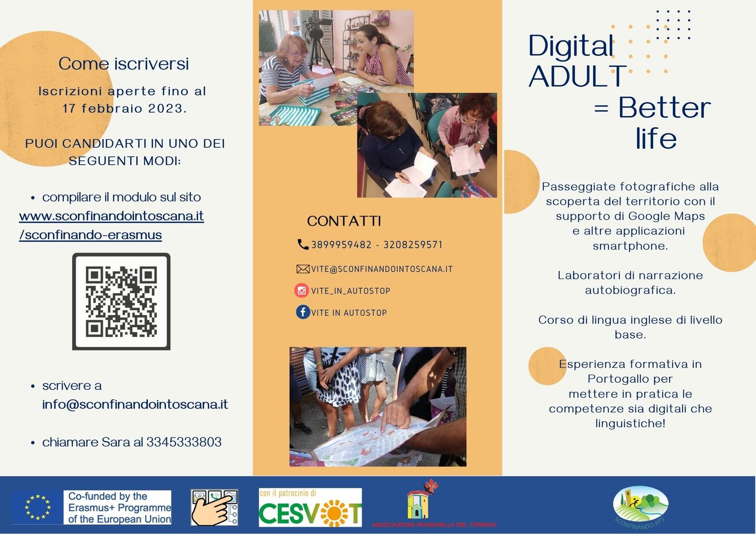 Tante nuove opportunità, a cura dell'APS Sconfinando, per gli over 50, grazie al progetto Erasmus+ "Digital Adult = a Better Life" che offrirà un’opportunità per scoprire il nostro rapporto con gli strumenti digitali. Un progetto che permetterà di offrire opportunità interamente gratuite per partecipare ad attività di socializzazione fornendo un contesto per lo sviluppo di competenze digitali base, nelle quali i partecipanti impareranno a usare le applicazioni dello smartphone e i programmi del computer utili per mantenere e consolidare le proprie relazioni sociali e per facilitare lo svolgimento delle attività quotidiane (acquisti online, prenotazioni, google maps, pagamenti…).