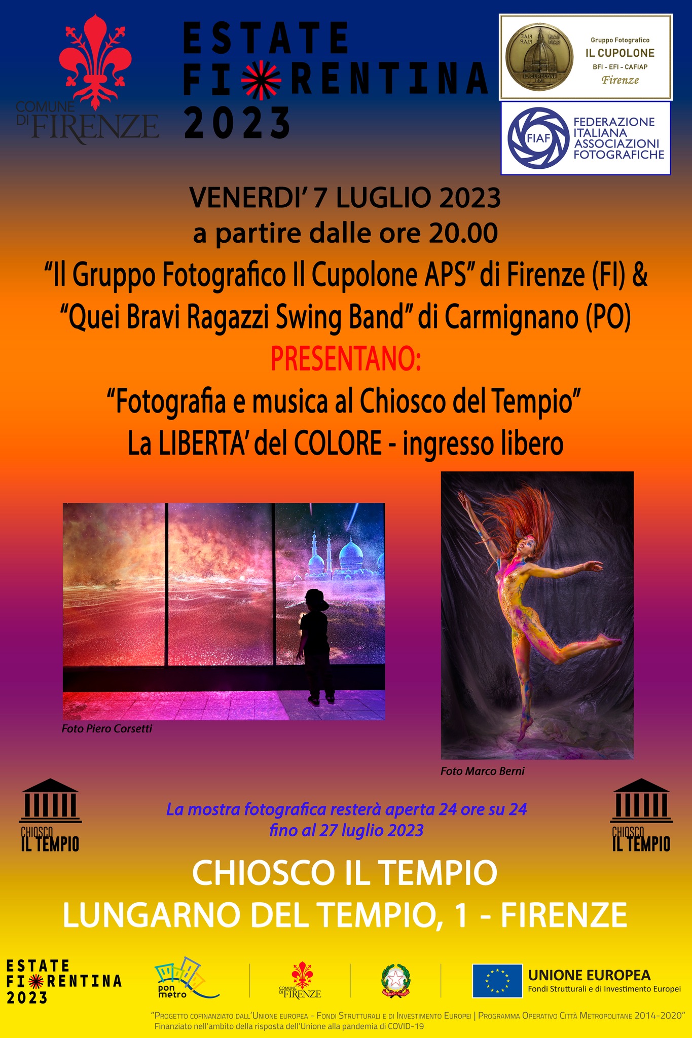 Venerdì 7 Luglio a partire dalle ore 20.00, presso il Chiosco del Tempio nei Giardini Caponnetto, si terrà l'inaugurazione della mostra fotografica "La libertà del colore", a cura dell'A.P.S. Gruppo Fotografico Il Cupolone nell'ambito della rassegna "Fotografia e musica al Chiosco del Tempio" realizzata con il contributo dell'Estate Fiorentina.