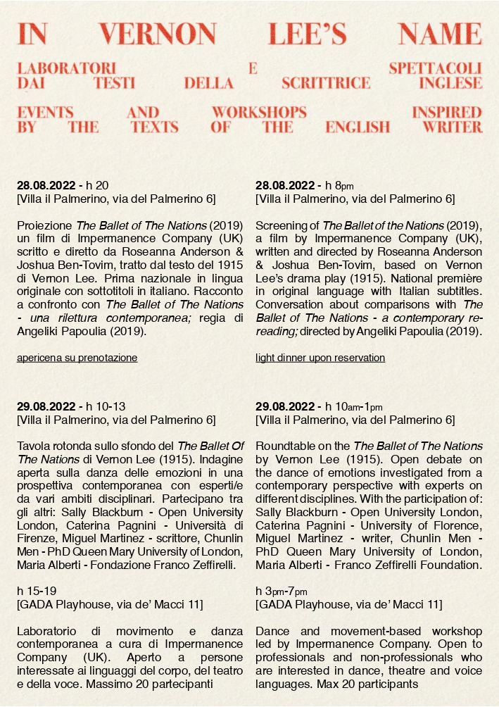 Dal 28 al 31 agosto presso la Villa il Palmerino, sede dell’Associazione Culturale Il Palmerino aps e allo spazio GADA, Playhouse si terranno numerosi eventi legati al testo The Ballet of the Nations (1915) della scrittrice inglese Vernon Lee, residente a Villa il Palmerino per quasi 50 anni a cavallo tra i due secoli. Nel 2019 due compagnie, all’insaputa l’una dell’altra, hanno tratto ispirazione da The Ballet of the Nations e hanno prodotto due versioni: un film di teatro-danza realizzato da Impermanence Company con sede a Bristol e un atto teatrale site-specific diretto dalla regista greca Angeliki Papoulia e realizzato presso la Villa il Palmerino.