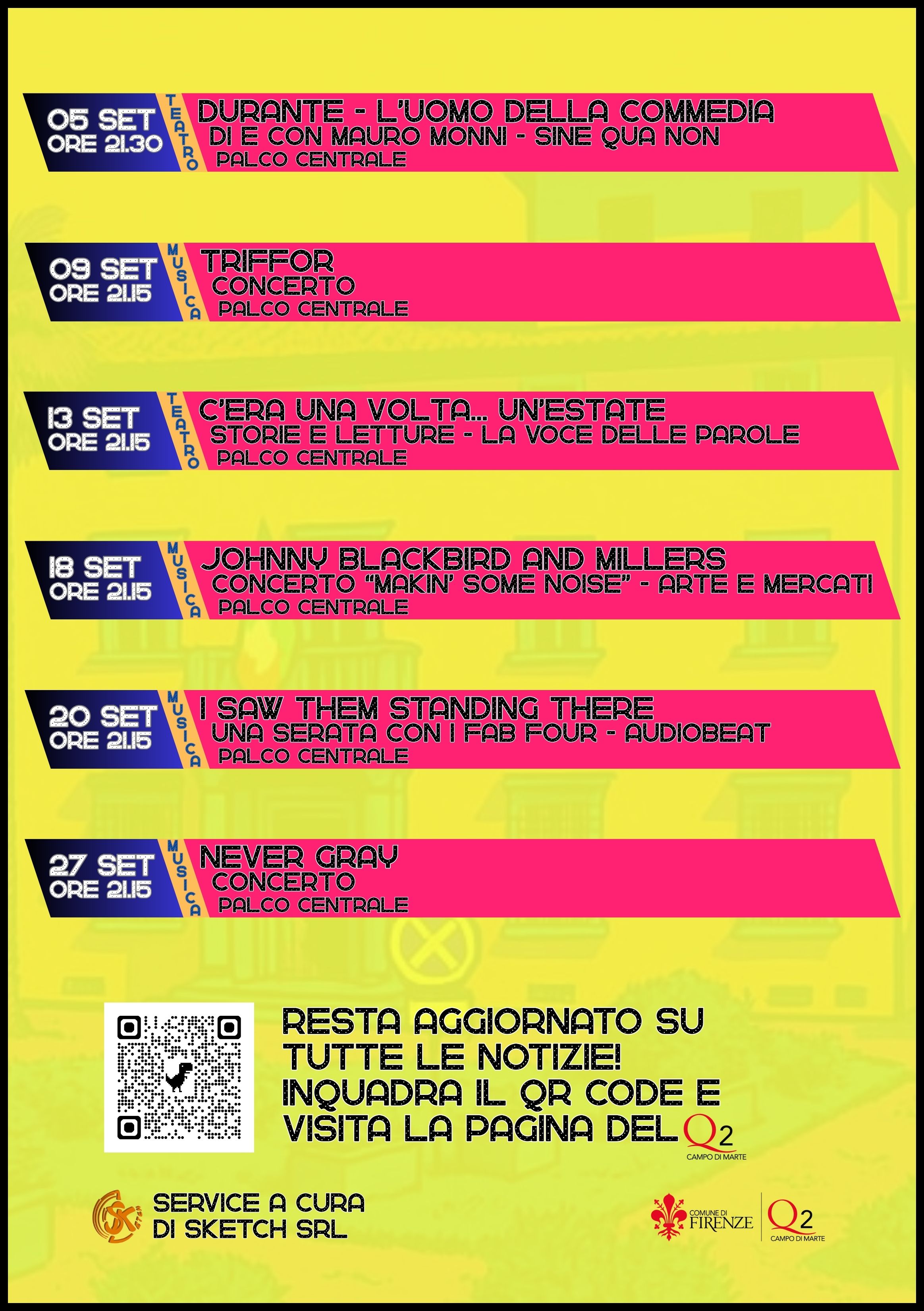 Prosegue anche nel mese di Settembre l'Estate in Villa al Quartiere 2, la rassegna estiva di eventi nella sede del Quartiere; spettacoli teatrali, concerti, proiezioni di film e tanto altro, per un'estate all'insegna della musica e della cultura. A Settembre ci aspettano appuntamenti teatrali di spessore e tanta musica.