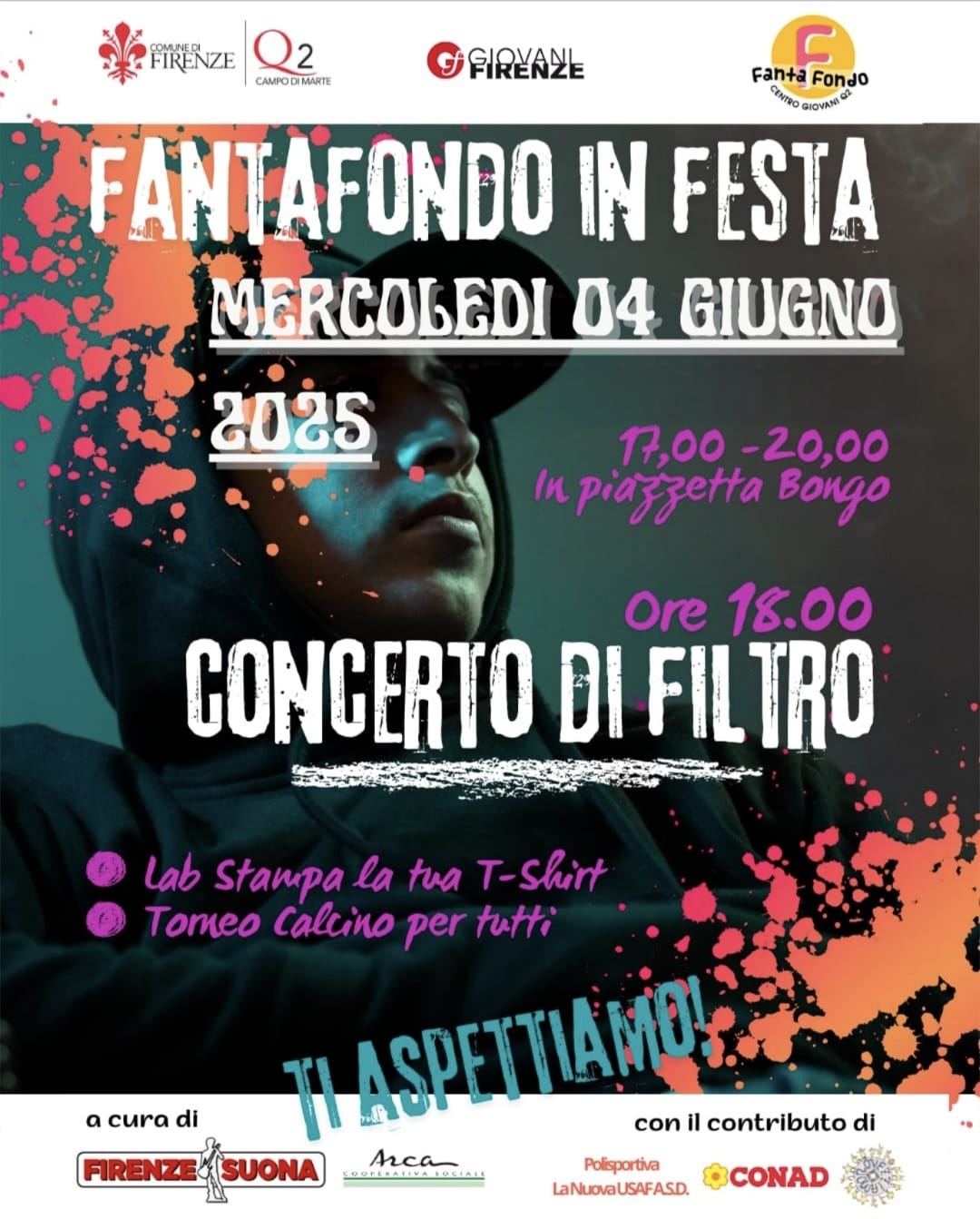 Mercoledì 4 Giugno alle ore 17.00, in Piazzetta Bongo, si terrà la manifestazione "Fantafondo in festa", in occasione della giornata della legalità, in un evento a cura di Firenze Suona e Arca Cooperativa Sociale con il patrocinio del Comune di Firenze e la collaborazione di Conad e della Polisportiva La Nuova Usaf.