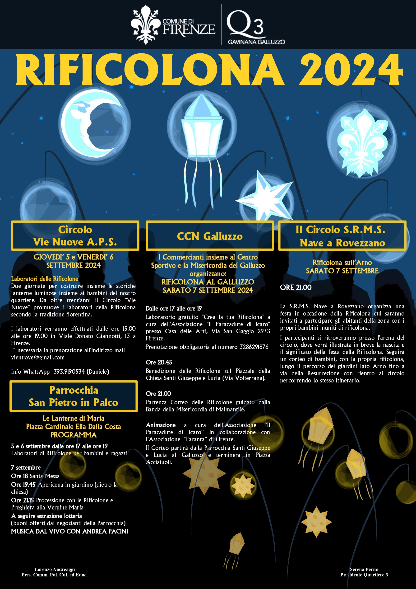 Si parte giovedì 5 e venerdì 6 settembre con i laboratori delle Rificolone presso il Circolo delle Vie Nuove in viale Donato Giannotti n. 13: in queste due giornate si svolgeranno dei laboratori per costruire insieme le storiche lanterne luminose. I laboratori (ad offerta libera) si svolgeranno dalle ore 15:00 alle ore 19:00. Per partecipare è gradita la prenotazione scrivendo all’indirizzo e-mail vienuove@vienuove.it.