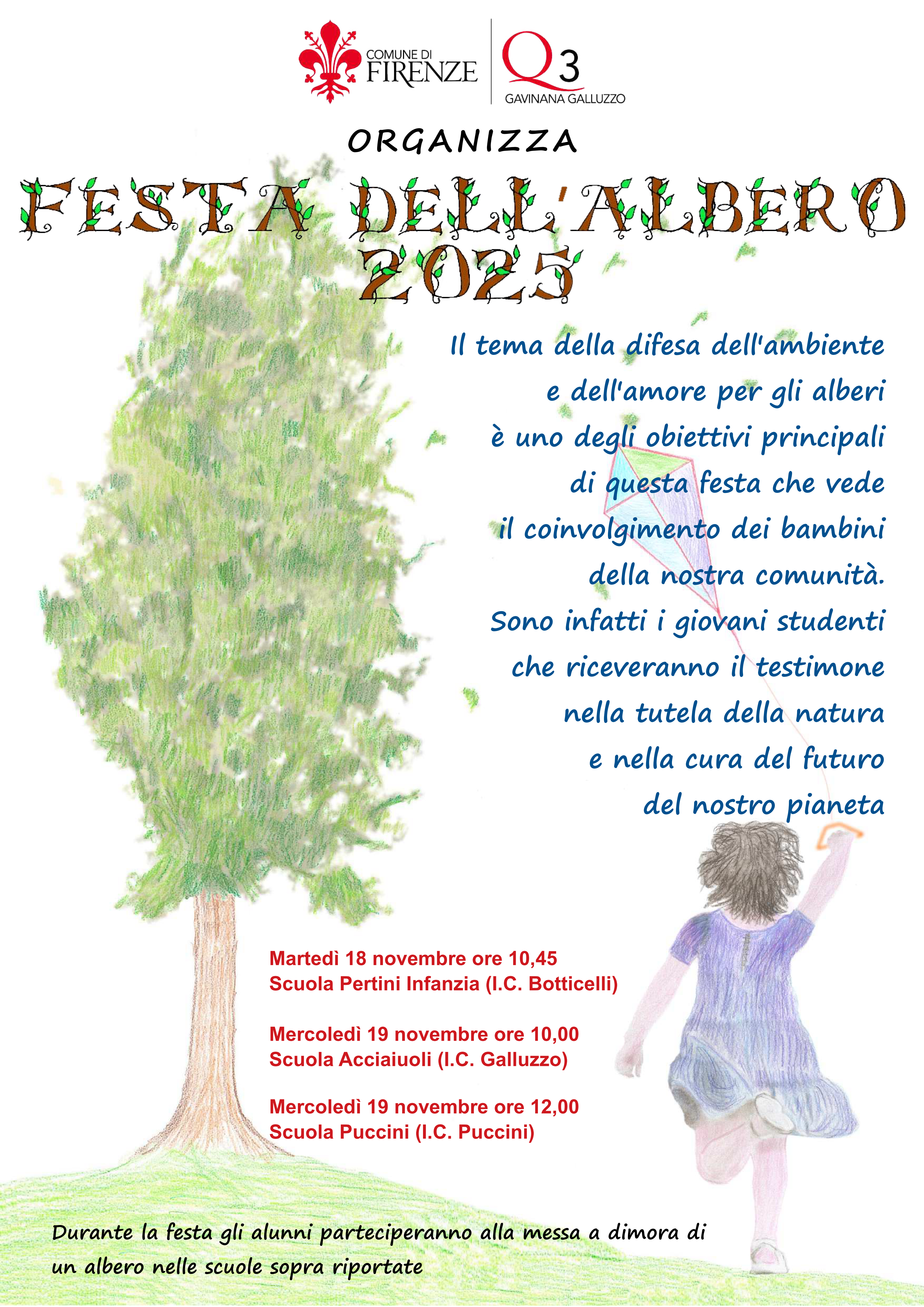 Si parte martedì 18 novembre alle ore 10.45 con la scuola dell'infanzia Pertini (I.C. Botticelli) e si prosegue mercoledì 19 novembre alle ore 10.00 con la scuola Acciaiuoli (I.C. Galluzzo) e la scuola Puccini (I.C. Puccini) alle ore 12:00.