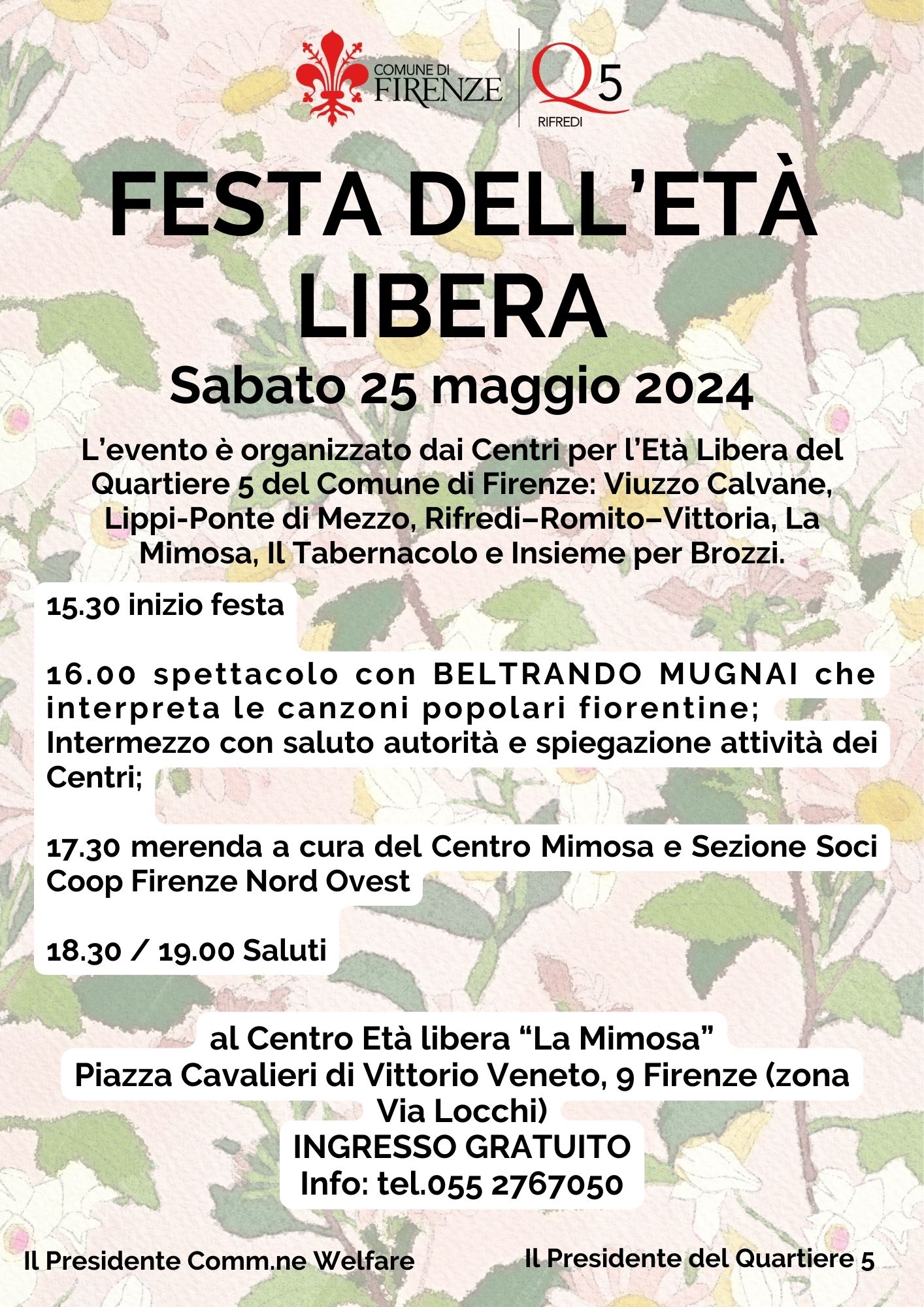 I Centri per l’Età Libera del Quartiere 5, Viuzzo Calvane, Lippi-Ponte di Mezzo, Rifredi–Romito–Vittoria, La Mimosa, Il Tabernacolo e Insieme per Brozzi, vi aspettano per la festa dell’Età Libera che si terrà Sabato 25 maggio al Centro “La Mimosa” Piazza Cavalieri di Vittorio Veneto, 9 Firenze (zona Via Locchi).