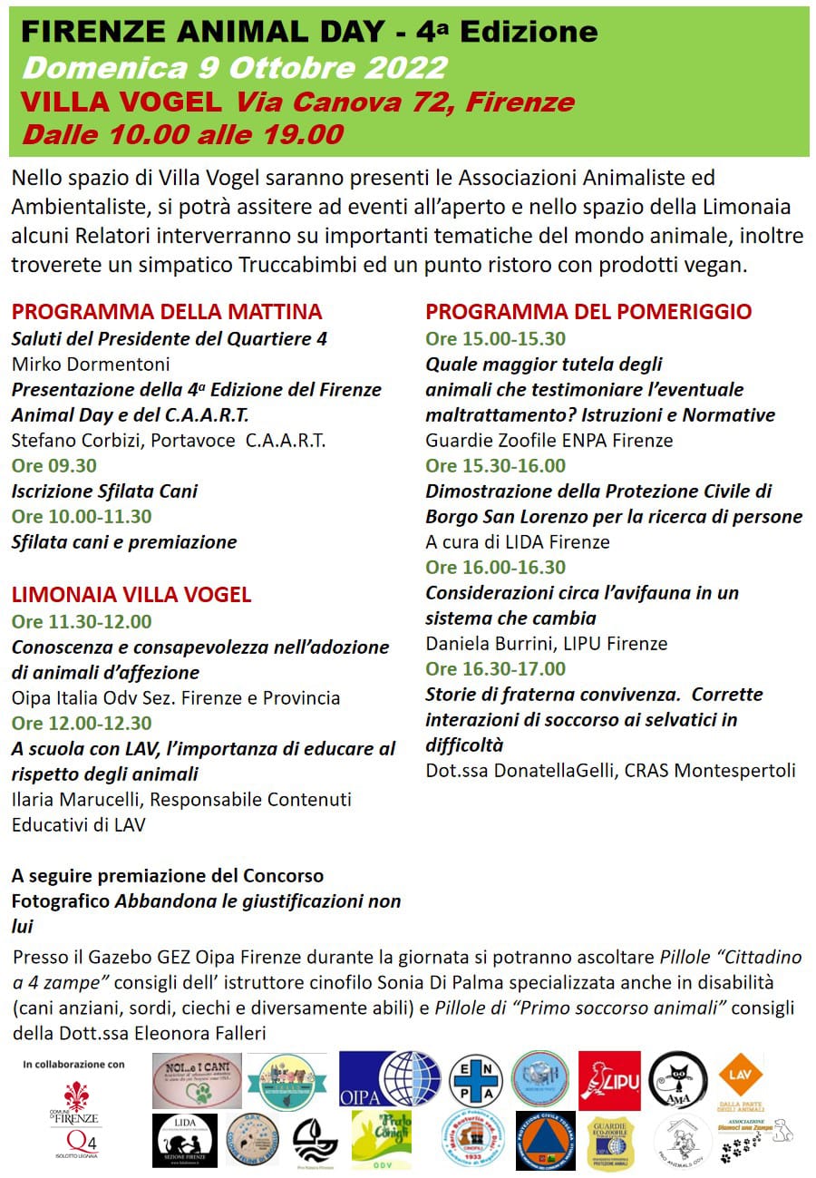 L’Associazione Lida, con la collaborazione del Quartiere 4 e di numerose associazioni animaliste e ambientaliste, organizza la quarta edizione del Firenze Animal Day, che si svolgerà domenica 9 ottobre, nel Parco di Villa Vogel, in via Canova 72, a Firenze, dalle 10 alle 19.