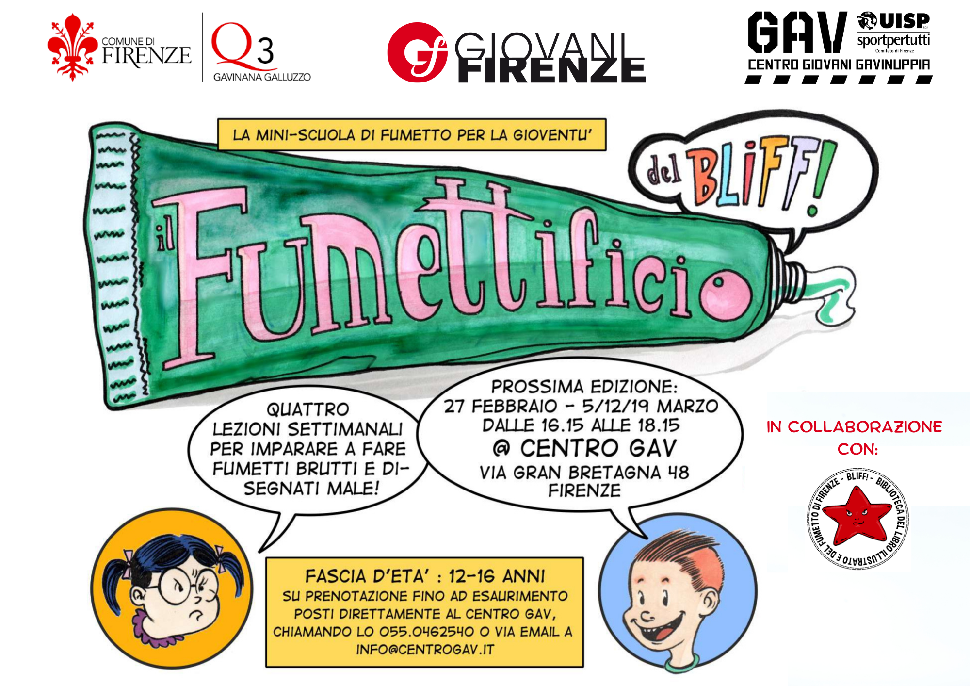 Il centro GAV propone il FUMETTIFICIO un programma per gli adolescenti dai 12 ai 16 anni, con lo scopo di avvicinare i ragazzi al fumetto approfondendo le basi della narrazione per immagini. Un laboratorio pratico che aiuterà ad inventare e disegnare storie e personaggi, per poter vivere al meglio questa entusiasmante esperienza dedicata alla scoperta dei propri talenti espressivi e della propria interiorità.