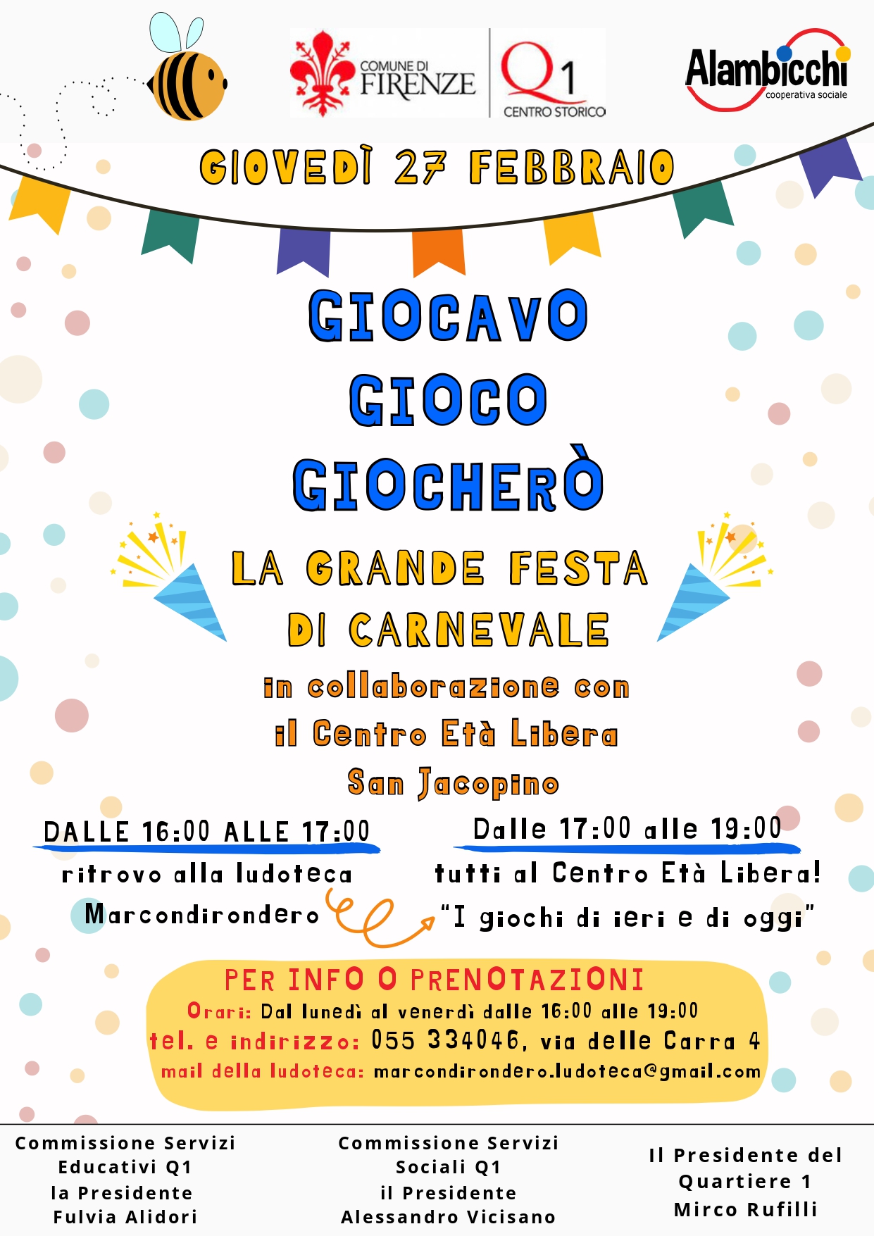dalle 16.00 alle 17.00 ritrovo alla ludoteca Marcondirondero dalle 17.00 alle 19.00 tutti al Centro età libera per i giochi di ieri e di oggi