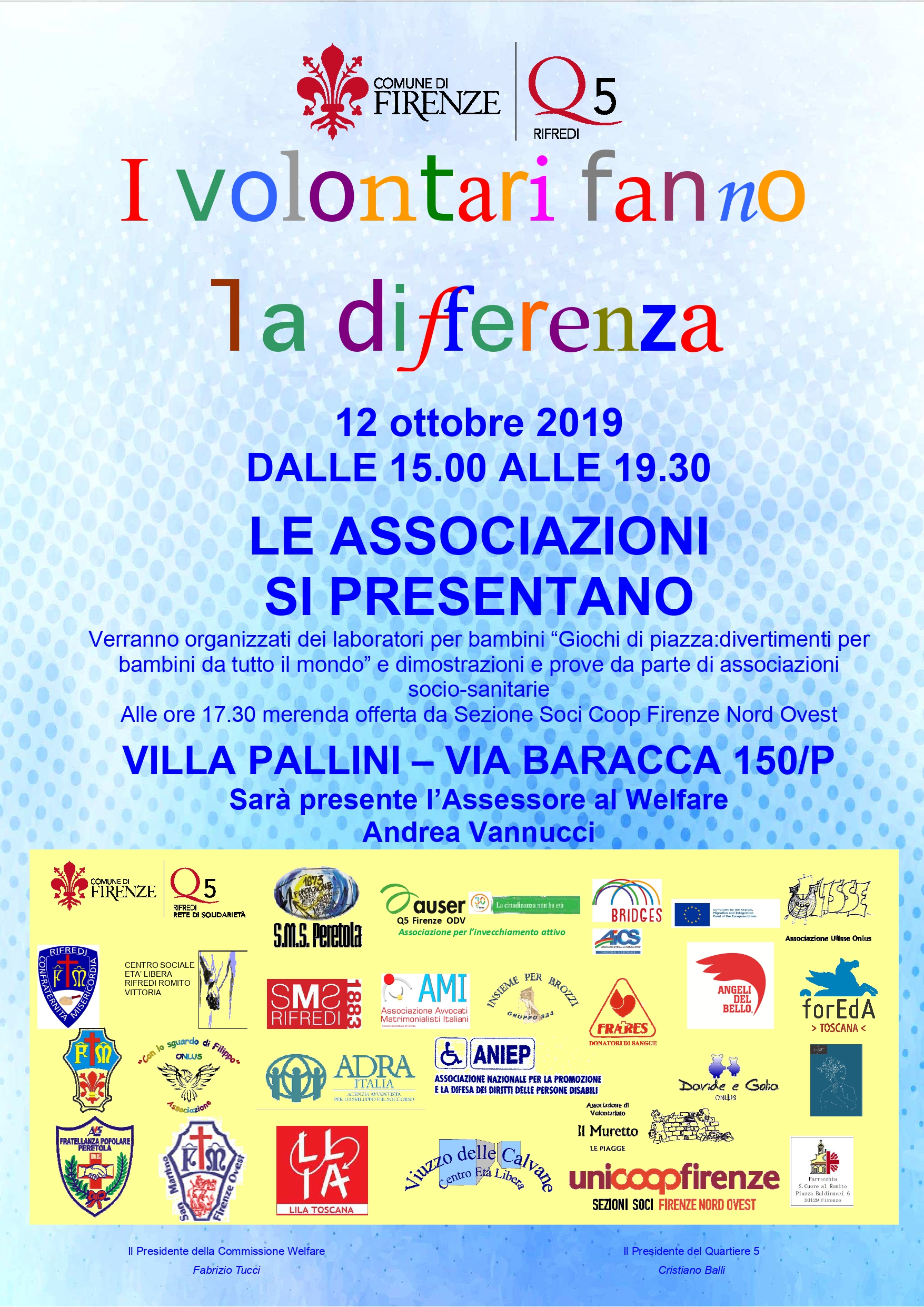 A Villa Pallini torna per la terza volta la manifestazione “I volontari fanno la differenza – Le Associazioni si presentano” con 27 realtà associative del quartiere che aderiscono al Patto Formativo e alla Rete di Solidarietà.