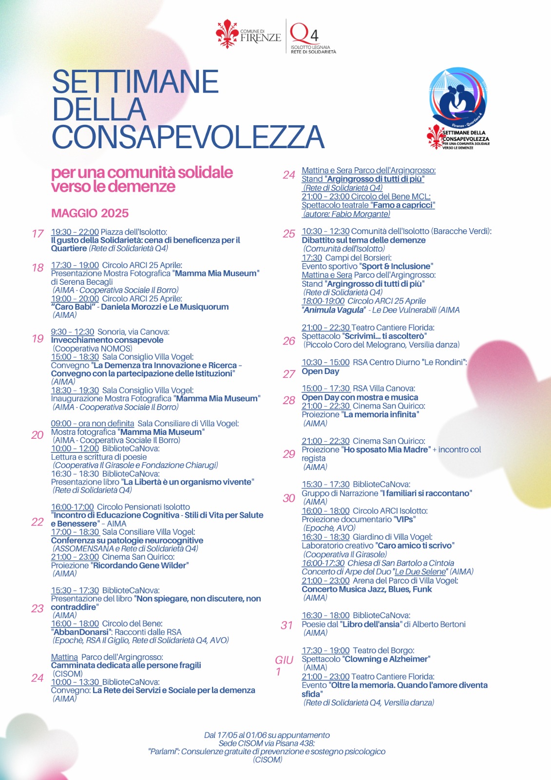 Dal 17 maggio al 1° giugno 2025, il Quartiere 4 del Comune di Firenze promuove la Settimana della Consapevolezza, un ricco calendario di iniziative per sensibilizzare la cittadinanza sul tema delle demenze e costruire una comunità più inclusiva e solidale.