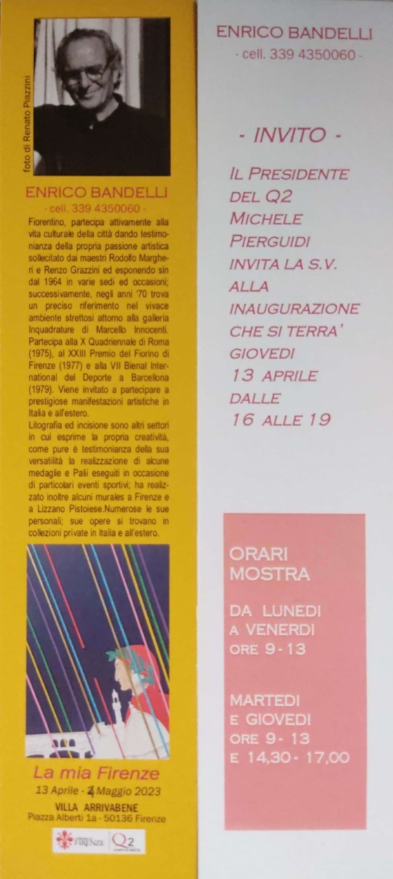 Giovedì 13 Aprile alle ore 16.00, nella sala Libero Beghi in Villa Arrivabene, si terrà l'inaugurazione della mostra "La mia Firenze", a cura dell'artista Enrico Bandelli con la collaborazione del Quartiere 2.