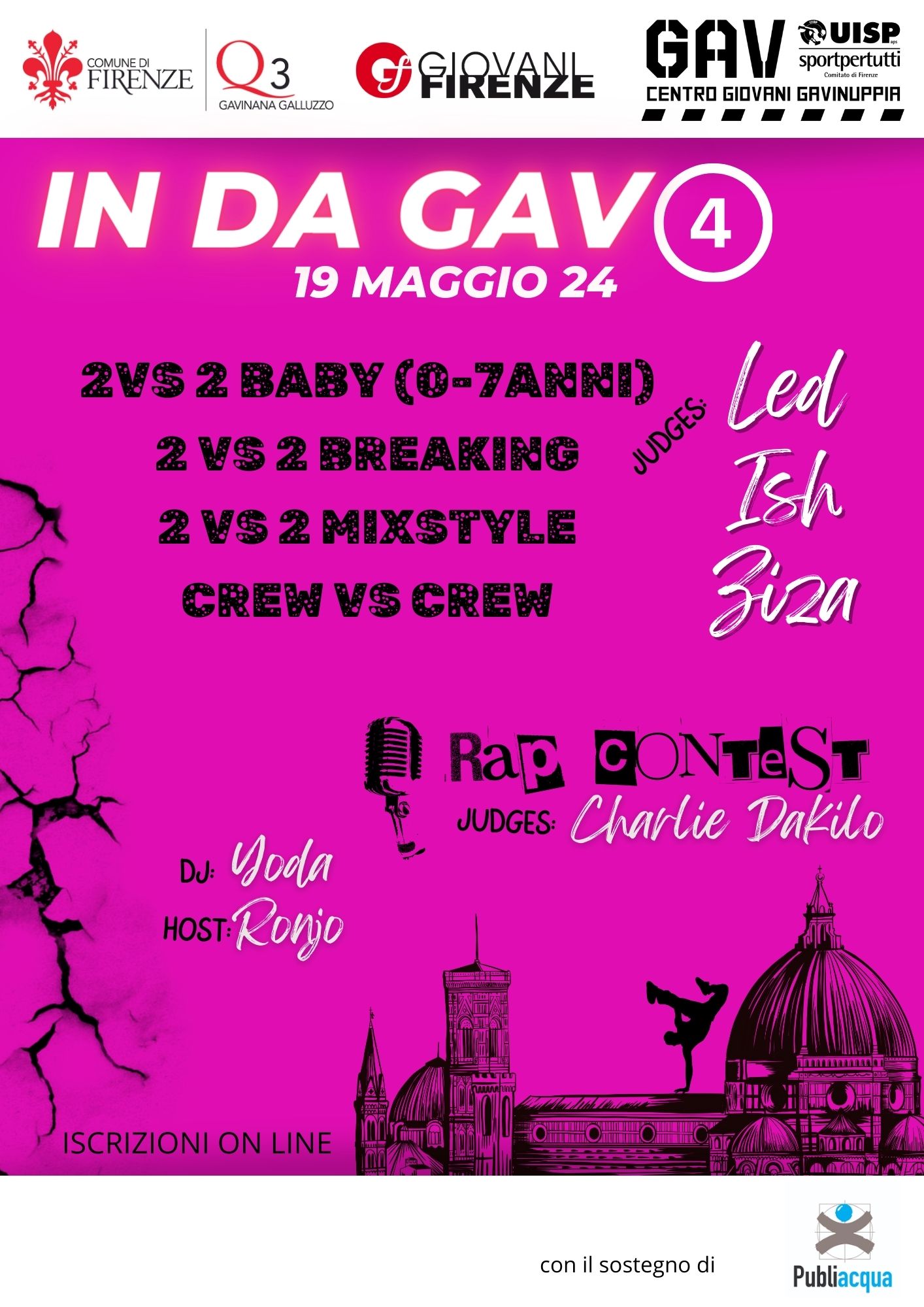 Dopo il successo delle prime tre edizioni, il CENTRO GAV (via Gran Bretagna 48, Firenze), ripropone il 19 maggio alle ore 14:00 IN DA GAV 4: il progetto nasce dal desiderio di promuovere la cultura dell’arte di strada dall’hip hop, la break dance, i graffiti e il rap a tutta la cittadinanza. IN DA GAV è un viaggio attraverso le culture musicali, è l’energia e la forza dell’hip hop, è un’ occasione di incontro e di divertimento per in una dimensione creativa, intergenerazionale e priva di barriere, una giornata a ingresso e partecipazione libera dedicata all' arte della break dance, con battle, jam e tanto divertimento.