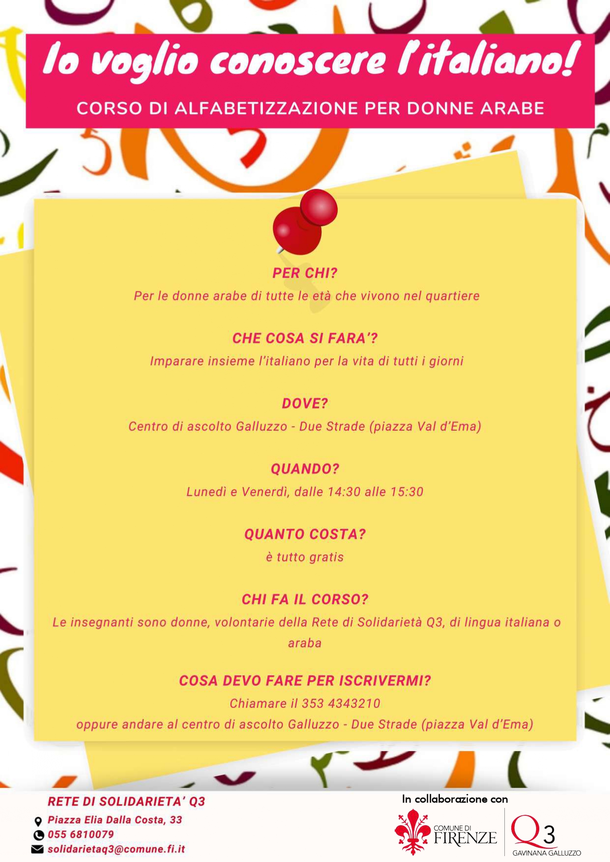 Al via nel Quartiere 3 il corso promosso dalla Rete di Solidarietà del Quartiere 3 che si prefigge di aiutare le donne arabe nella conoscenza della lingua italiana al fine di raggiungere il traguardo di leggere e scrivere in italiano.