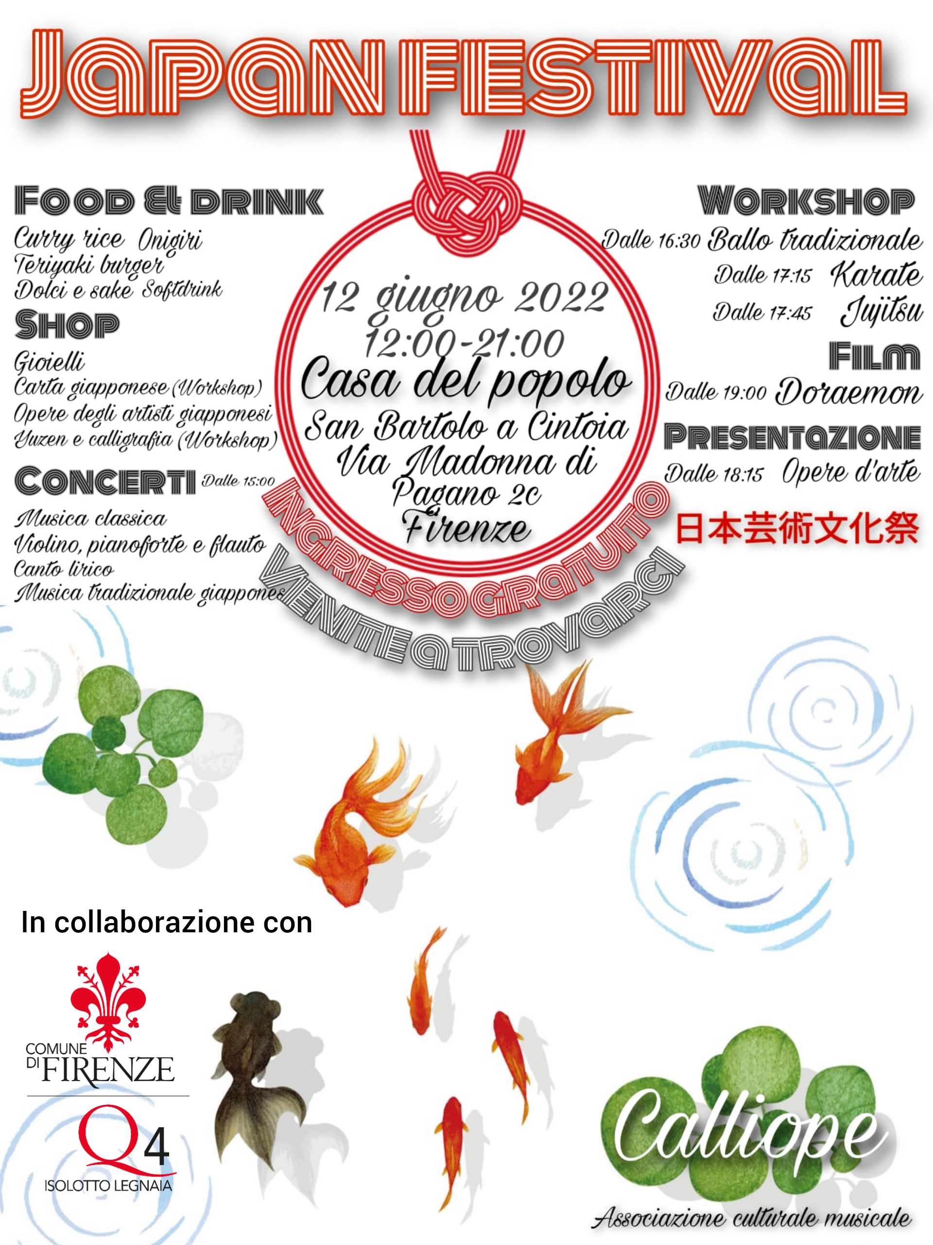 L’Associazione culturale musicale Calliope, in collaborazione con il Quartiere 4, organizza Japan Festival, che si svolgerà domenica 12 giugno, alla Casa del Popolo di San Bartolo a Cintoia, in via Madonna di Pagano 2C, a Firenze. Apertura della festa alle 12.