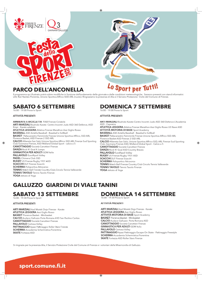 La festa nel Quartiere 3 si svolgerà sabato 6 e domenica 7 settembre presso il Parco Albereta - Anconella in via di Villamagna dalle ore 16:00 alle ore 19:00 e proseguirà sabato 13 e domenica 14 settembre all’interno dei Giardini di viale Tanini al Galluzzo dalle ore 16:00 alle 19:30.