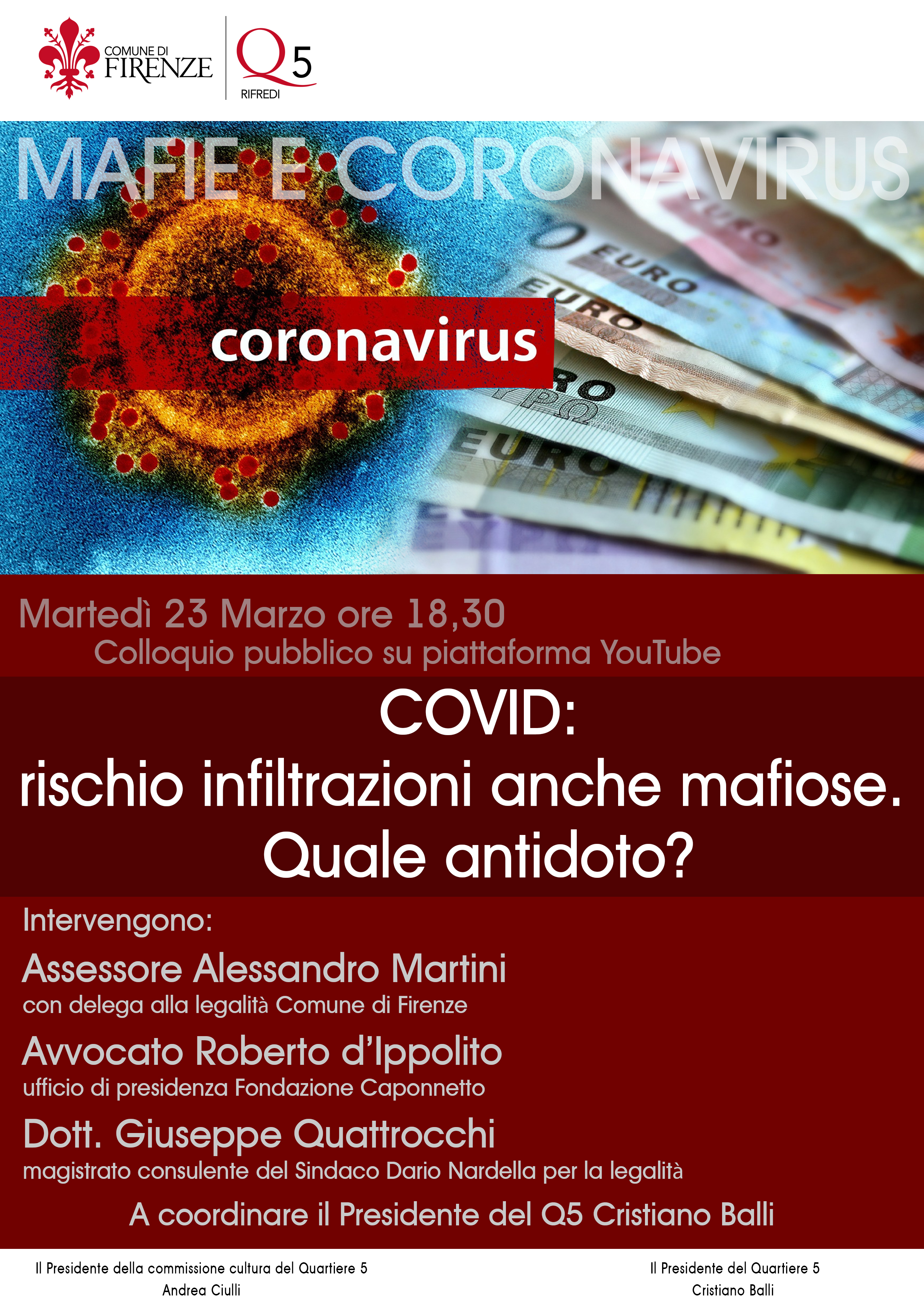 Il Quartiere 5, in occasione della Giornata Nazionale della Memoria e dell’Impegno in ricordo delle vittime innocenti delle mafie, organizza un evento in streaming dove interverranno l’Assessore Alessandro Martini del Comune di Firenze, con delega alla cultura della memoria e della legalità, l’Avvocato Roberto d’Ippolito, della Fondazione Capponetto, il Giudice Giuseppe Quattrocchi, consulente del Sindaco Nardella per la legalità. Modererà il Presidente del Quartiere 5, Cristiano Balli.