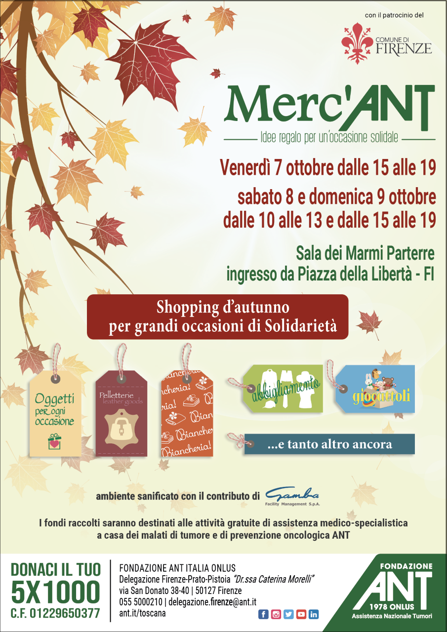 Da Venerdì 7 a Domenica 9 Ottobre ritorna alla Sala dei Marmi del Parterre, in Piazza Libertà, il consueto mercatino solidale promosso dalla Fondazione ANT; un’occasione per trovare tante cose nuove e vintage, tra oggettistica, abbigliamento, bigiotteria, cosmesi, pelletteria, ceramica, prodotti eno-gastronomici e tanto altro, frutto della solidarietà di aziende e privati.