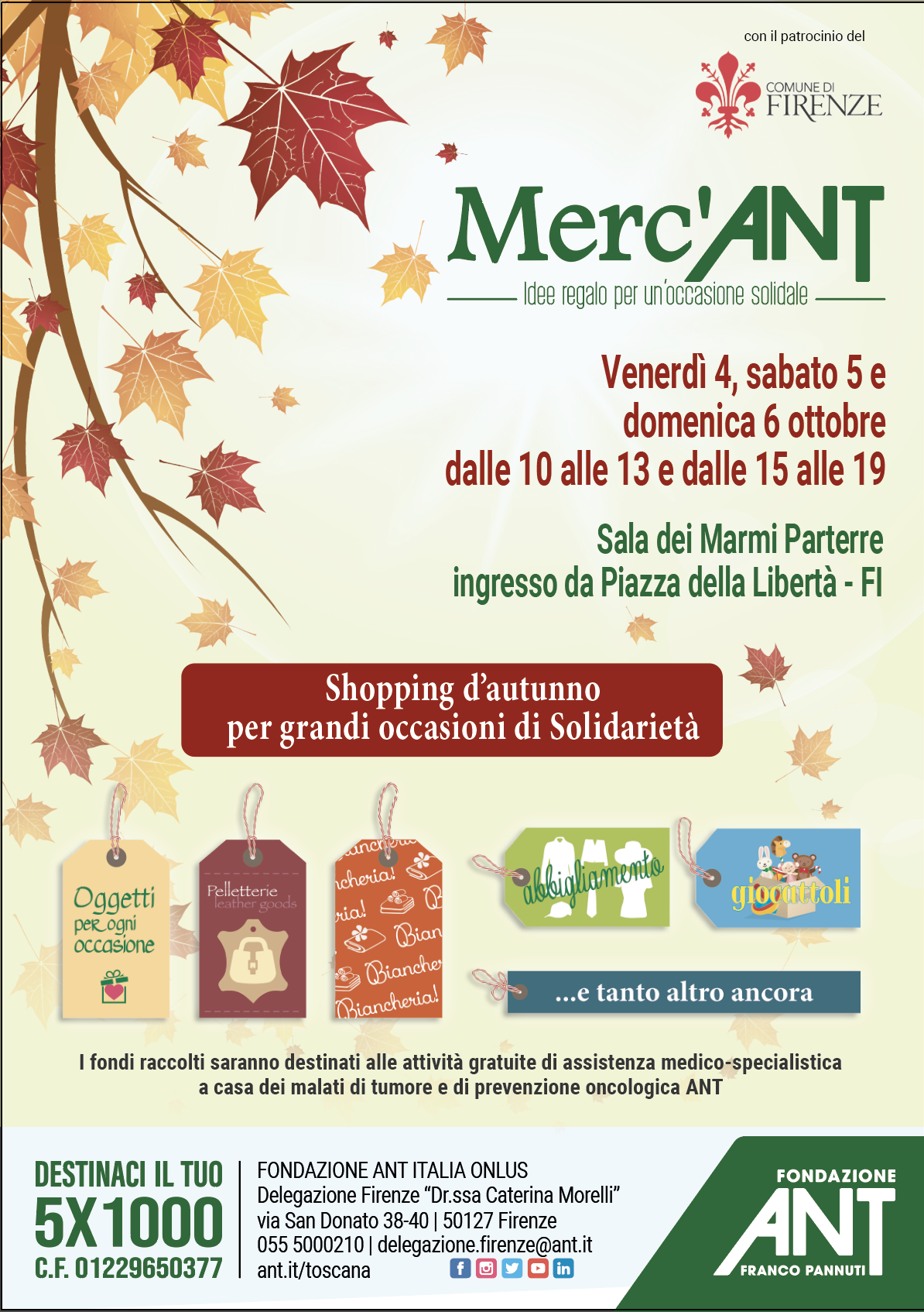 Torna il Merc'ANT con l'edizione autunnale nel 2024, il mercatino solidale proposto da Fondazione ANT Onlus con il patrocinio del Comune di Firenze i cui proventi andranno interamente a sostenere le attività di assistenza domiciliare e specialistica che ANT offre gratuitamente ai malati di tumore e alle loro famiglie in 10 regioni italiane tra cui la Toscana (dove opera a Firenze, Prato, Pistoia) e i progetti di prevenzione oncologica sempre gratuiti portati avanti dalla Fondazione.