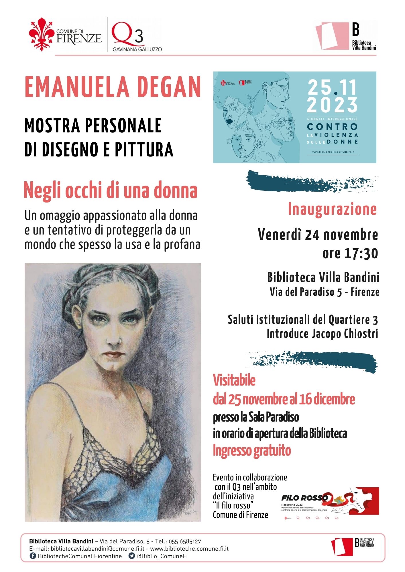 Nell'ambito dell'iniziativa "Il filo rosso" contro la violenza sulle donne, la biblioteca Villa Bandini ospita una mostra personale di disegno e pittura dell'autrice Emanuela Degan: un omaggio appassionato alla donna e un tentativo di proteggerla da un mondo che spesso la usa e la profana.