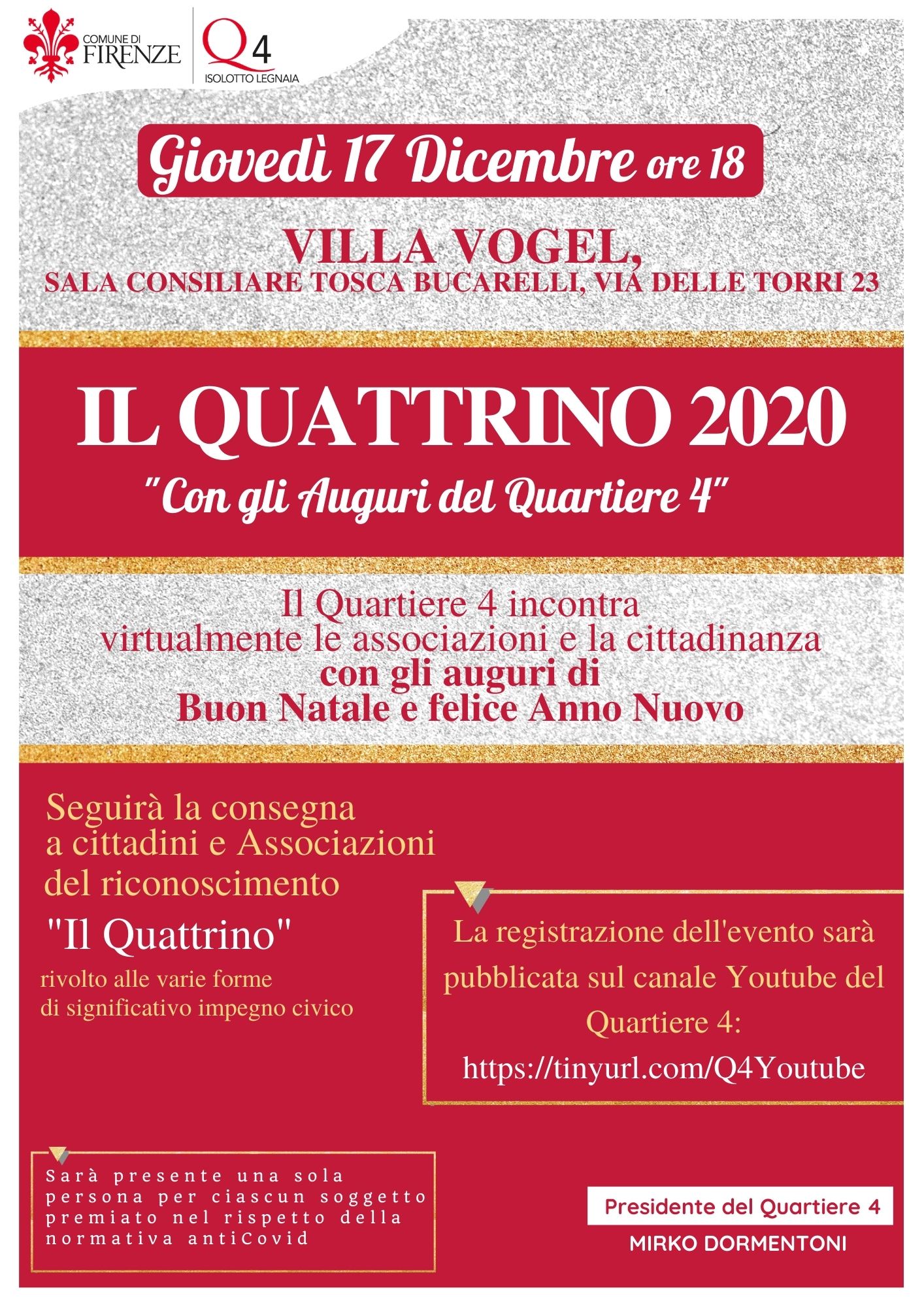 Nel rispetto delle norme antiCovid19, la cerimonia si svolgerà giovedì 17 dicembre 2020, alle 18, nella sala consiliare Tosca Bucarelli di Villa Vogel, alla presenza dei soli destinatari del riconoscimento. La registrazione dell'evento sarà poi pubblicata sul canale Youtube del Quartiere 4: https://tinyurl.com/Q4Youtube.