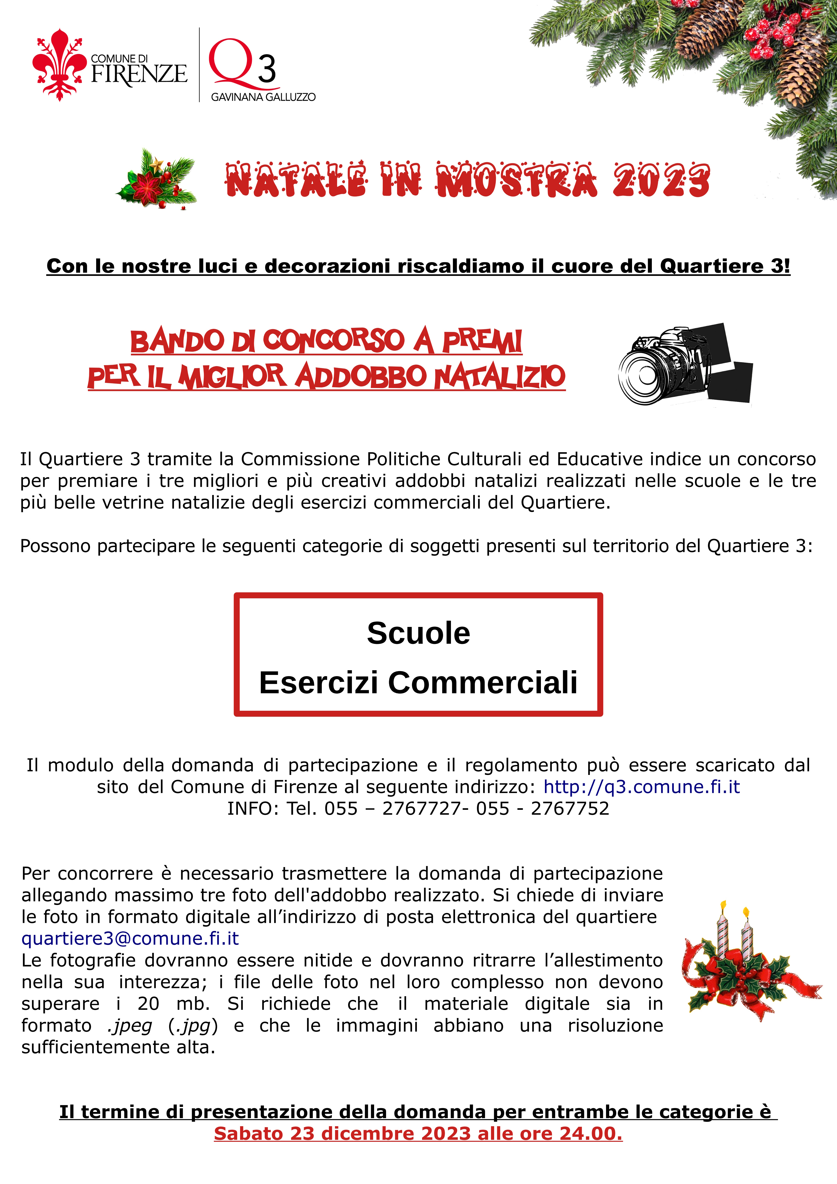 Per concorrere è necessario inviare la domanda di partecipazione compilata e firmata allegando max 3 foto dell'addobbo al seguente indirizzo e-mail: quartiere3@comune.fi.it.