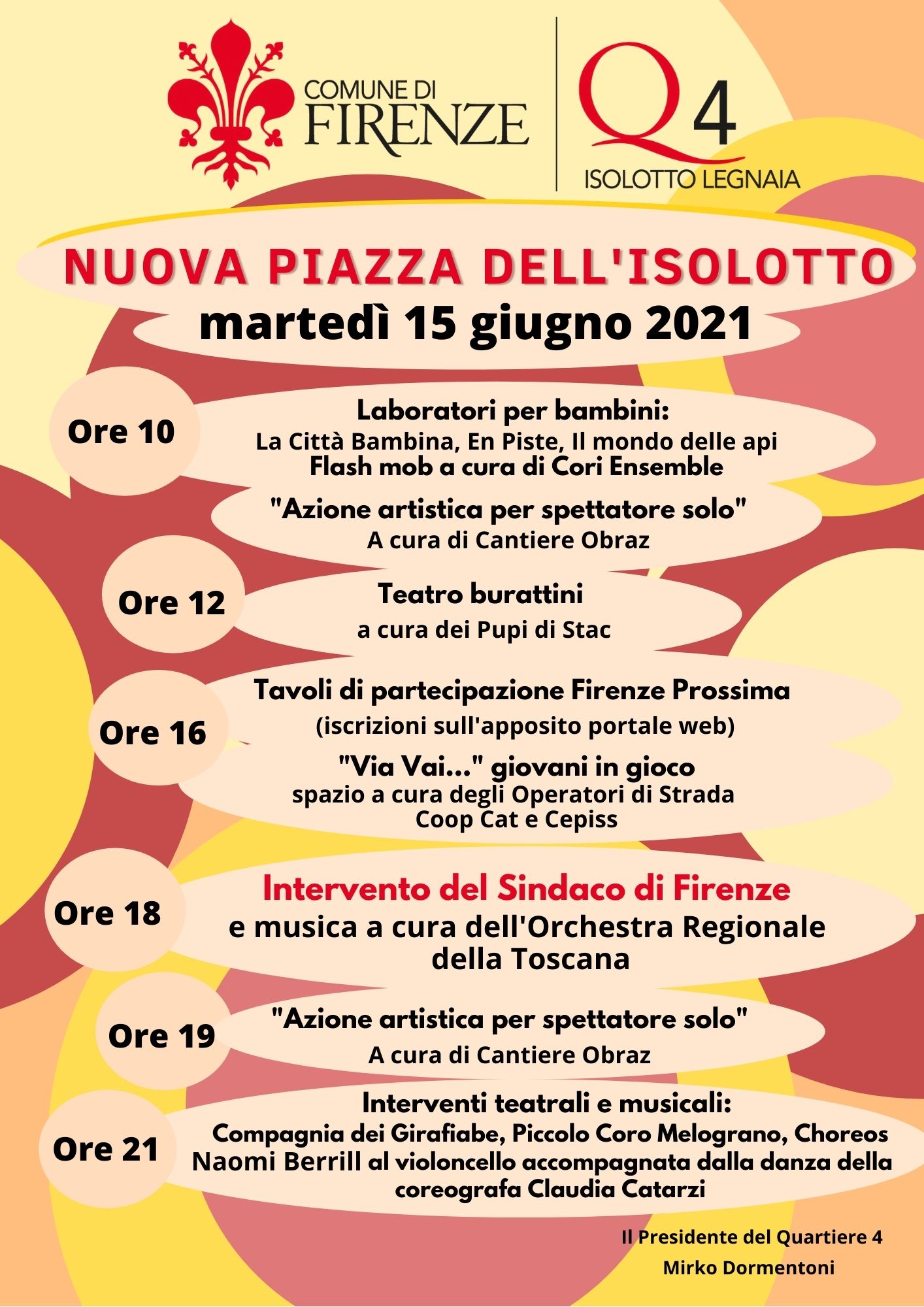 Martedì 15 giugno dalle ore 10 fino alle 21, giornata dedicata alla Nuova Piazza dell'Isolotto. Il contributo artistico e operativo delle associazioni e soggetti, ha reso possibile la realizzazione di un programma ricco di iniziative culturali, nel rispetto delle distanze di sicurezza e delle regole anticovid vigenti.