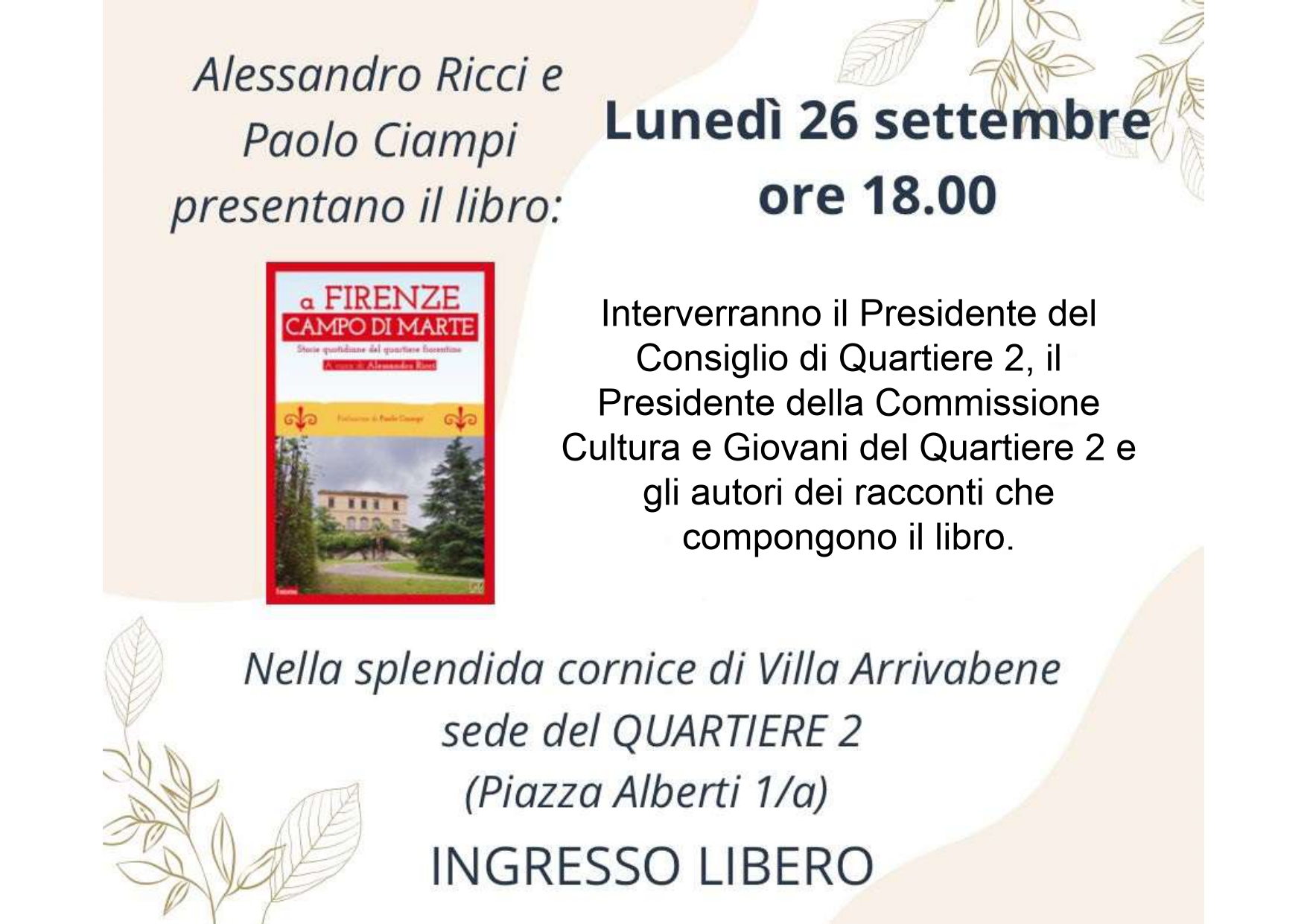 Lunedì 26 Settembre alle ore 18, nella sede del Quartiere 2 in Villa Arrivabene, verrà presentato il nuovo libro a cura di Alessandro Ricci "A Firenze Campo di Marte", un itinerario sentimentale di ricordi e suggestioni nel nord-est del cuore fiorentino attraverso una raccolta di racconti di numerosi autori cittadini. Alla presentazione, nella quale interverranno gli autori dei racconti che compongono il libro, presenzieranno il Presidente del Consiglio di Quartiere 2 e il Presidente della Commissione Cultura e Giovani del Quartiere 2.