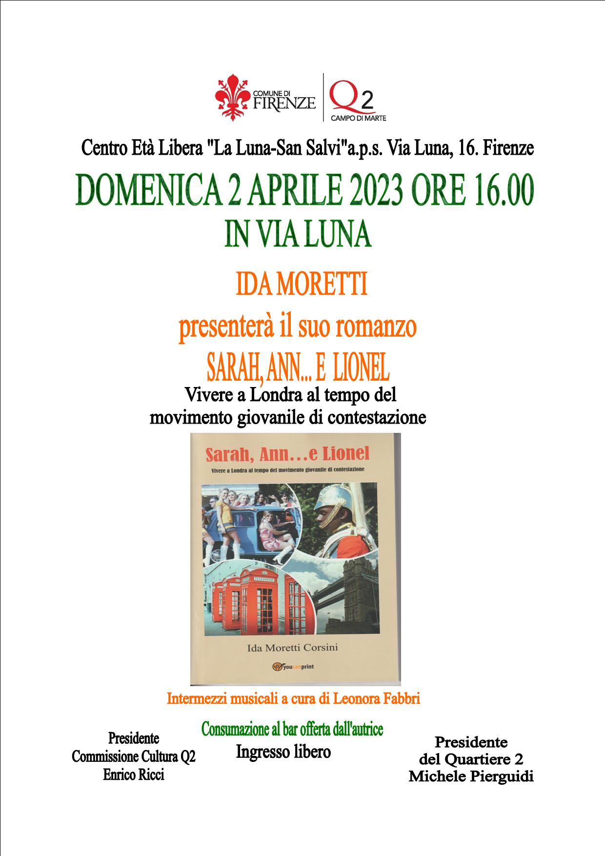 Domenica 2 Aprile alle ore 16.00, presso il centro Età Libera La Luna-San Salvi, si terrà la presentazione del libro "Sarah, Ann e Lionel", un romanzo dove la fantasia si intreccia con la realtà storica degli anni sessanta sullo sfondo della Londra al tempo della contestazione giovanile.