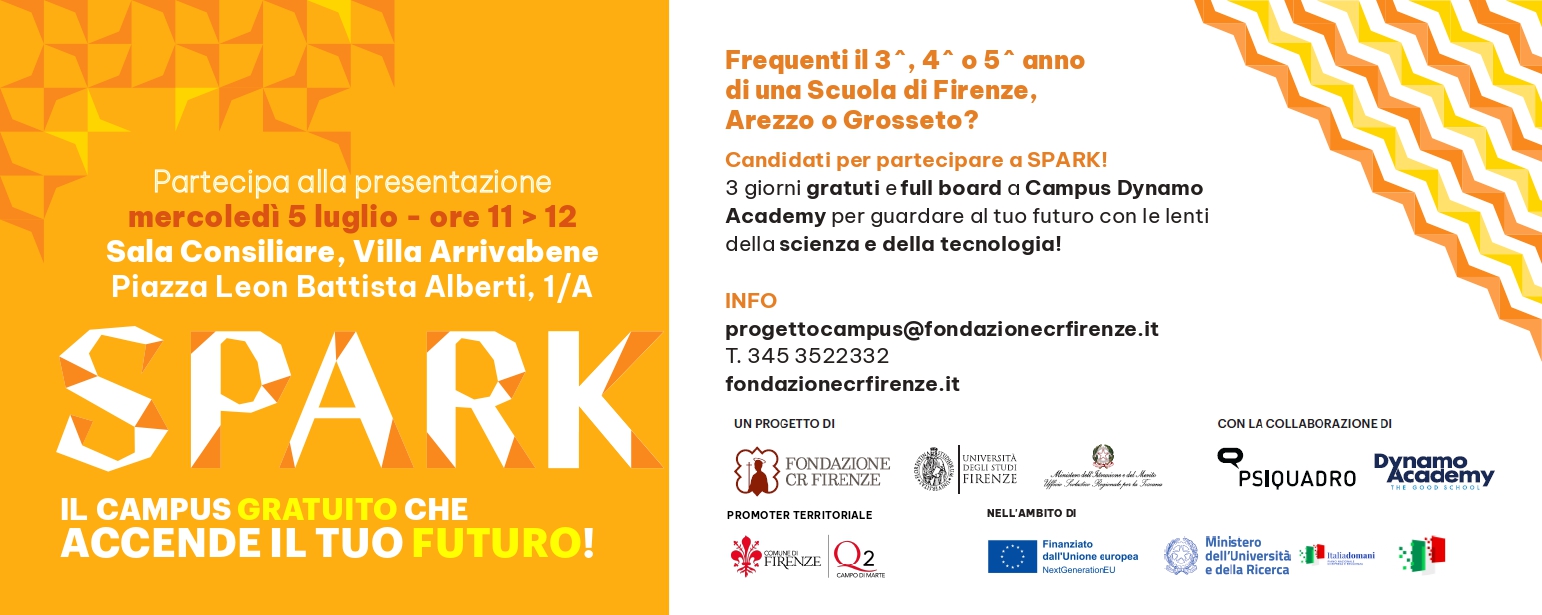 Al via il progetto Spark, un campus estivo residenziale rivolto ai giovani dai 16 ai 19 anni, con l'obiettivo di orientarsi tra le sfide più contemporanee della scienza e della tecnologia ed esercitarsi a fare scelte consapevoli. Il progetto, promosso da Fondazione CR Firenze, Università di Firenze e Ufficio Scolastico Regionale, insieme a Dynamo Academy e Psiquadro con la collaborazione del Quartiere 2, sarà articolato in quattro sessioni da 3 giorni l'una, interamente gratuite e comprensive di trasporto, che si svolgeranno presso la Dynamo Academy.