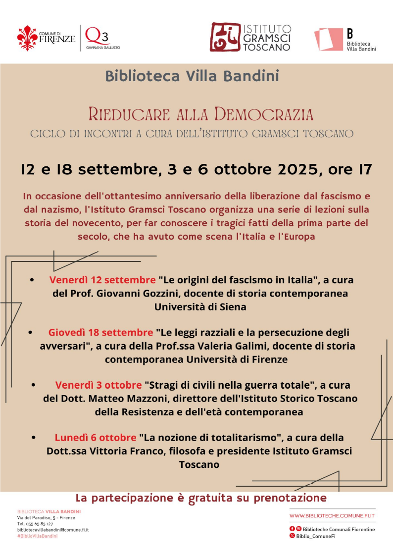 In occasione dell'ottantesimo anniversario della liberazione dal fascismo e dal nazismo, il Quartiere 3 del Comune di Firenze organizza in collaborazione con l'Istituto Gramsci Toscano una serie di lezioni sulla storia del novecento, per far conoscere la tragica storia della prima parte del secolo, che ha avuto come scena l'Italia e l'Europa, con due guerre mondiali, coi fascismi e col nazismo che hanno prodotto il dramma della Shoah e dello sterminio degli ebrei.