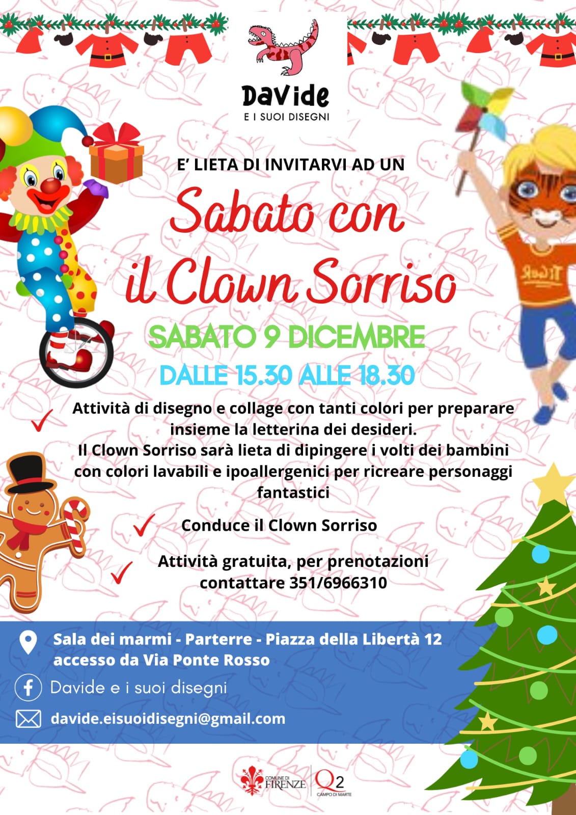 Il 9 dicembre, presso la Sala dei Marmi in Piazza della Libertà, avranno luogo attività di disegno destinate ai bambini, finalizzate alla preparazione della letterina dei desideri. Durante la manifestazione sarà presente il Clown Sorriso, il quale si occuperà di dipingere i volti dei piccoli partecipanti. Le attività saranno gratuite ma è richiesta la prenotazione al numero 3516966310.