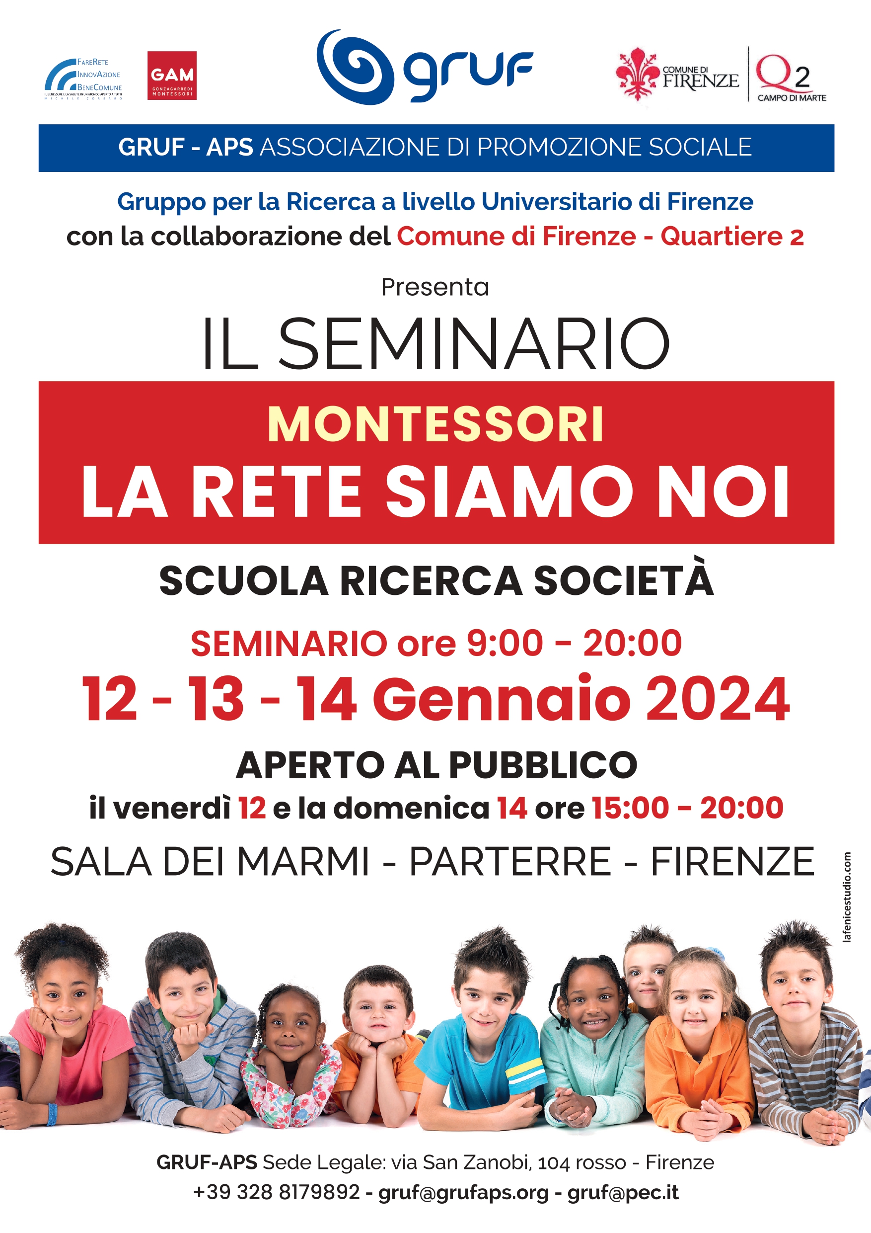 Il 12 - 13 - 14 gennaio avrà luogo, in Sala dei Marmi, il "Seminario Montessori: la rete siamo noi". Venerdì 14, dalle ore 15:00 alle ore 18:30, si terrà un evento aperto al pubblico denominato "Atelier Montessori" rivolto ai bambini (età 3 - 8 anni) e ai loro genitori. Domenica 14, dalle ore 14:30 alle ore 18:30, si svolgerà un altro evento aperto al pubblico denominato "Visite guidate tra le immagini dell'attività libera dei bambini Montessoriani, degli allestimenti dei laboratori e dei materiali di sviluppo".