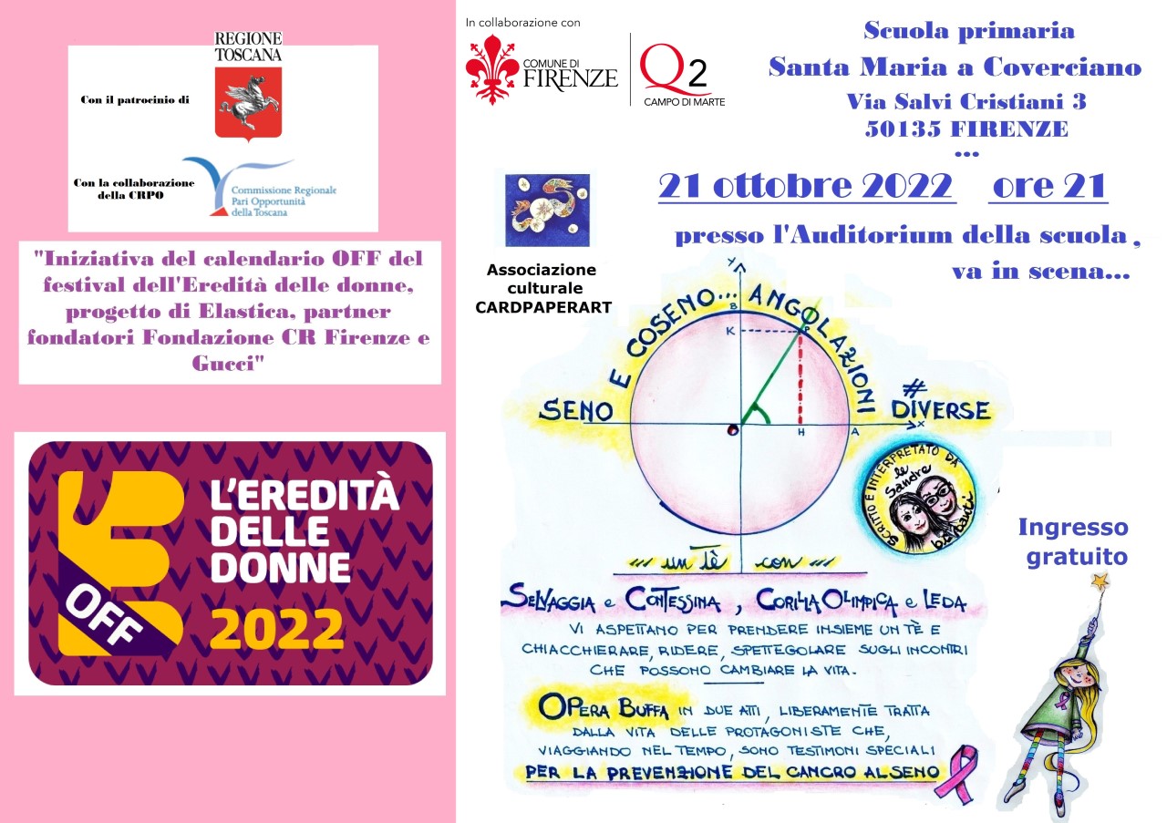 Il 21 Ottobre alle ore 21.00, nell'Auditorium della scuola Santa Maria a Coverciano (Via Salvi Cristiani 3), andrà in scena lo spettacolo teatrale "Seno e coseno... angolazioni diverse", promosso dall'Associazione culturale CardPaperArt nel contesto del Festival "L'eredità delle donne 2022". Lo spettacolo, un'opera buffa in due parti dedicata alla prevenzione del cancro al seno, è ad ingresso gratuito.