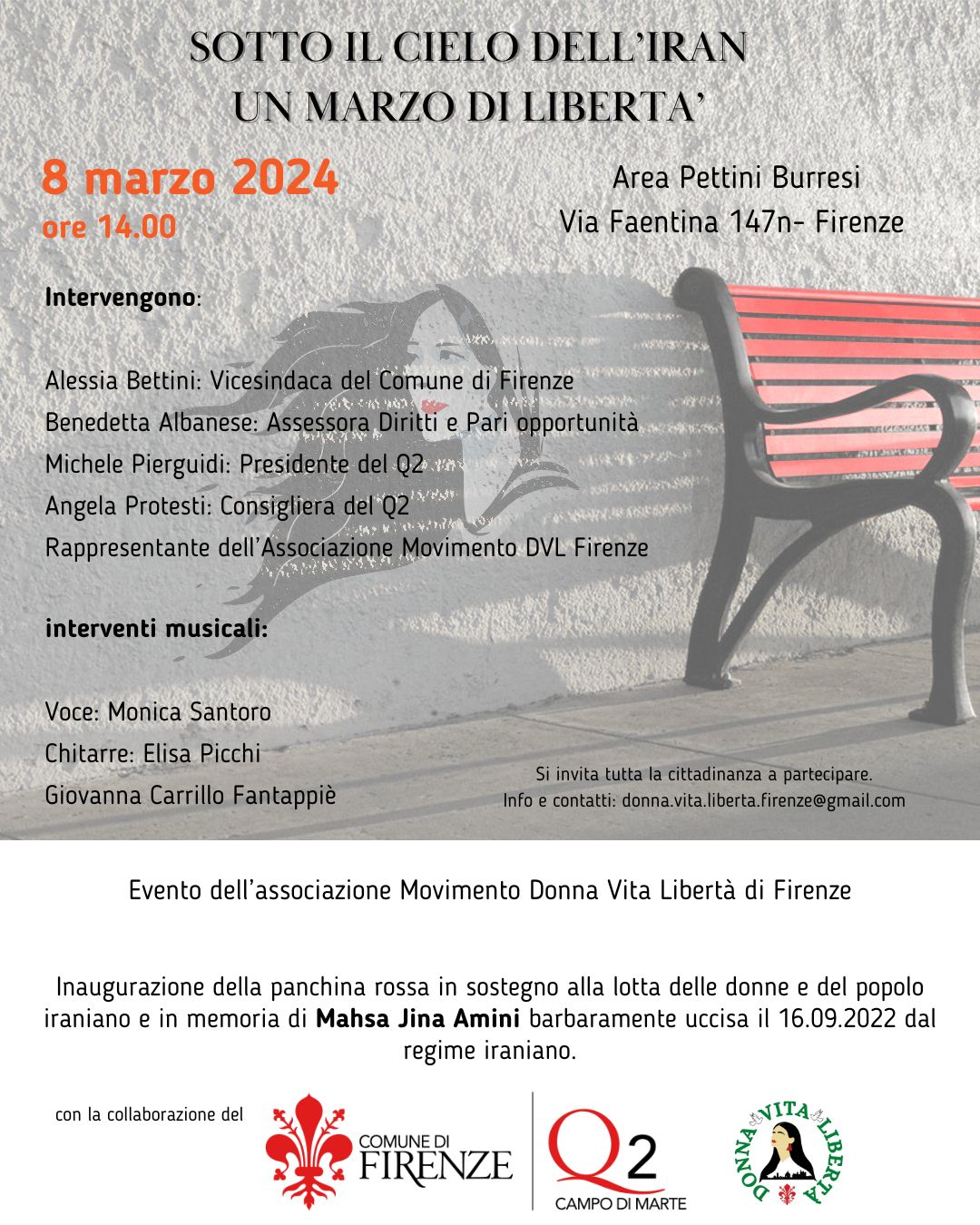 Venerdì 8 Marzo alle ore 14.00, all'Area Pettini Burresi, in occasione della Festa della Donna, si terrà l'inaugurazione della panchina rossa in sostegno alla lotta delle donne e del popolo iraniano e in memoria di Mahsa Jina Amini, barbaramente uccisa il 19 Settembre 2022 dal regime iraniano. All'evento, a cura dell'associazione "Movimento Donna Vita Libertà" con la collaborazione del Quartiere 2, presenzieranno la Vicensindaca Alessia Bettini, l'Assessora ai Diritti e alle Pari Opportunità Benedetta Albanese, il Presidente del Quartiere 2 Michele Pierguidi e la consigliera del Quartiere 2 Angela Protesti.