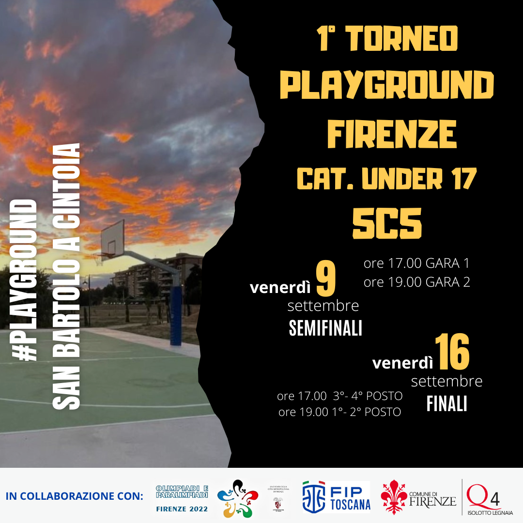 Al campo sportivo di basket a San Bartolo a Cintoia si svolgerà venerdì 9 e venerdì 16 settembre il 1° torneo di playground cat. under 17 5c5 .