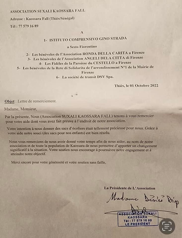 La consegna è avvenuta presso l'Associazione Suxali Kaossara a Thies a 80 km da Dakar: in totale 180 zaini scuola ad altrettanti studenti (siccome era giorno di scuola una parte è stata ritirata dalle loro mamme e nonne). Gli zaini sono stati donati e raccolti da studenti italiani e da varie associazioni. Giunge gradita lettera di riconoscenza dell' Associazione datata 1 ottobre e rivolta a:
