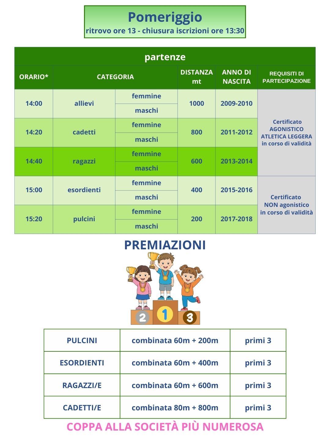Il ritrovo è fissato alle ore 9 per le gare giovanili della mattina, alle ore 13 per quelle del pomeriggio e alle ore 15 per la corsa competitiva e la ludico-motoria presso l’Impianto Bruno Betti. La partenza della corsa e della camminata è prevista alle ore 16. Le gare giovanili si svolgeranno in pista dalle 10 alle 11.30 e dalle 14 alle 15.20, secondo le categorie.