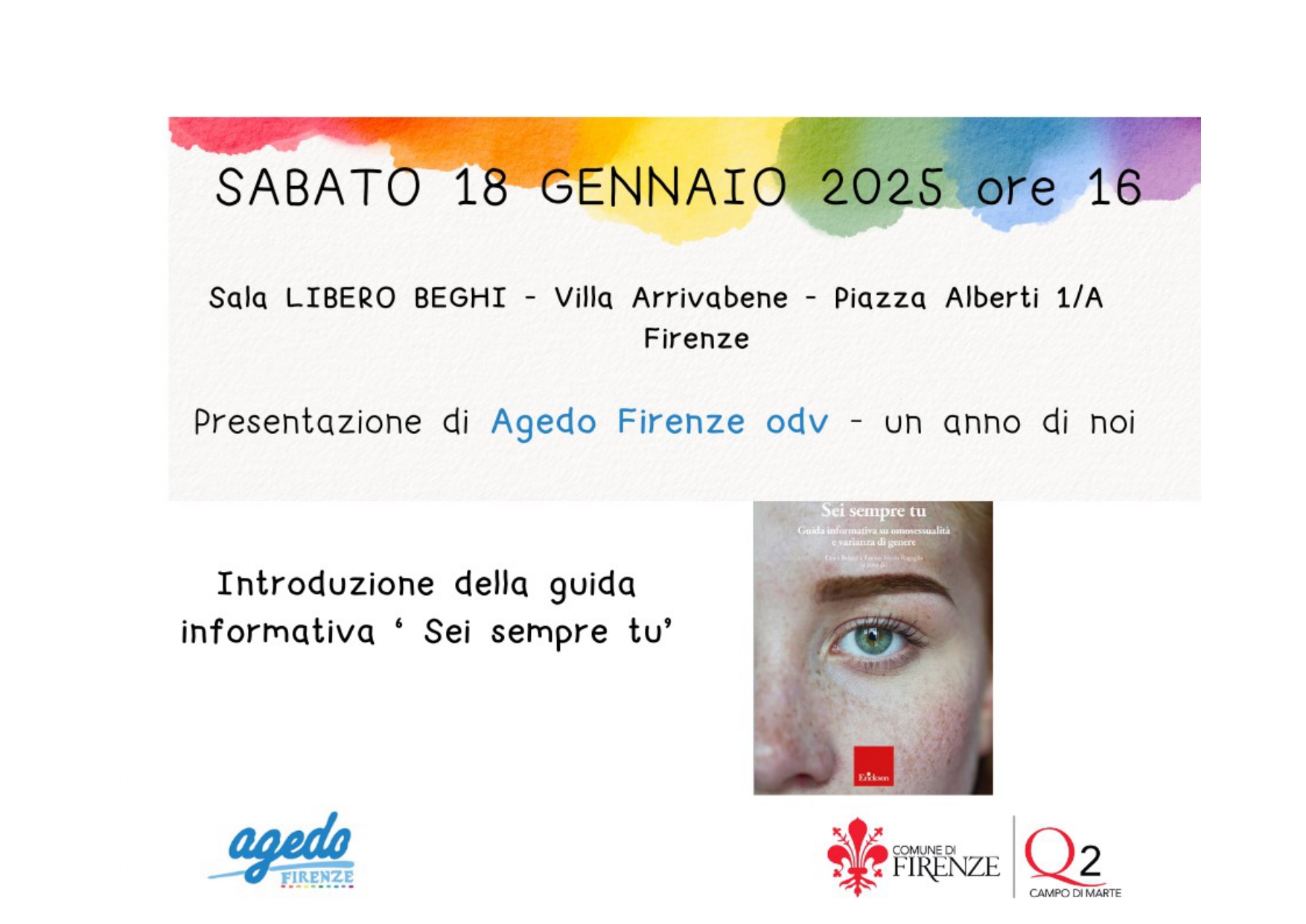 Sabato 18 Gennaio alle ore 16.00, nella Sala Libero Beghi in Villa Arrivabene, si terrà l'evento di presentazione della guida "Sei sempre tu - Guida informativa su omosessualità e varianza di genere", a cura di Agedo Firenze odv con la collaborazione del Quartiere 2.